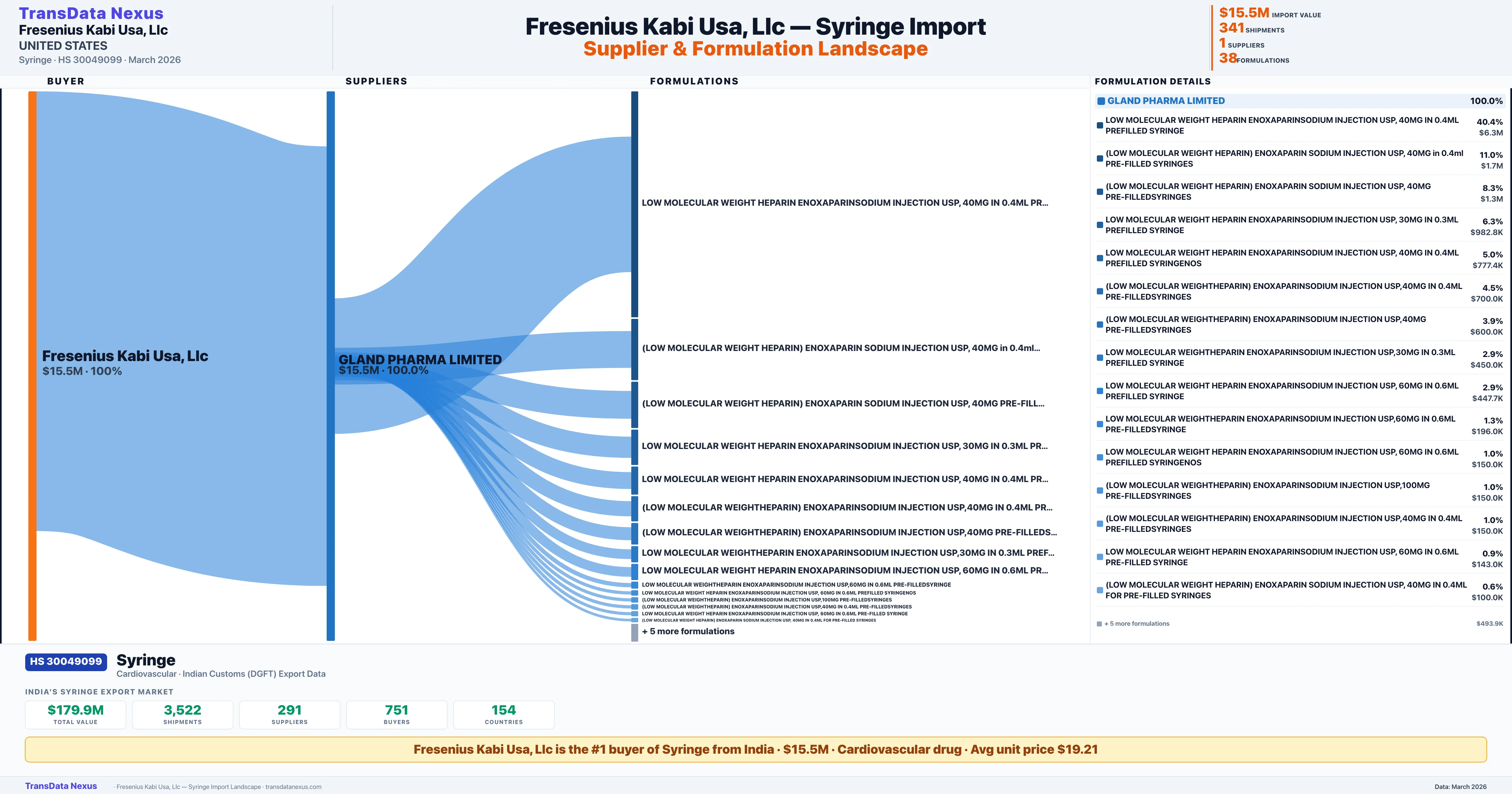 FRESENIUS KABI USA, LLC sources Syringe from 1 verified Indian supplier: GLAND PHARMA LIMITED ($15.5M, 100.0%). This is based on 341 customs records.