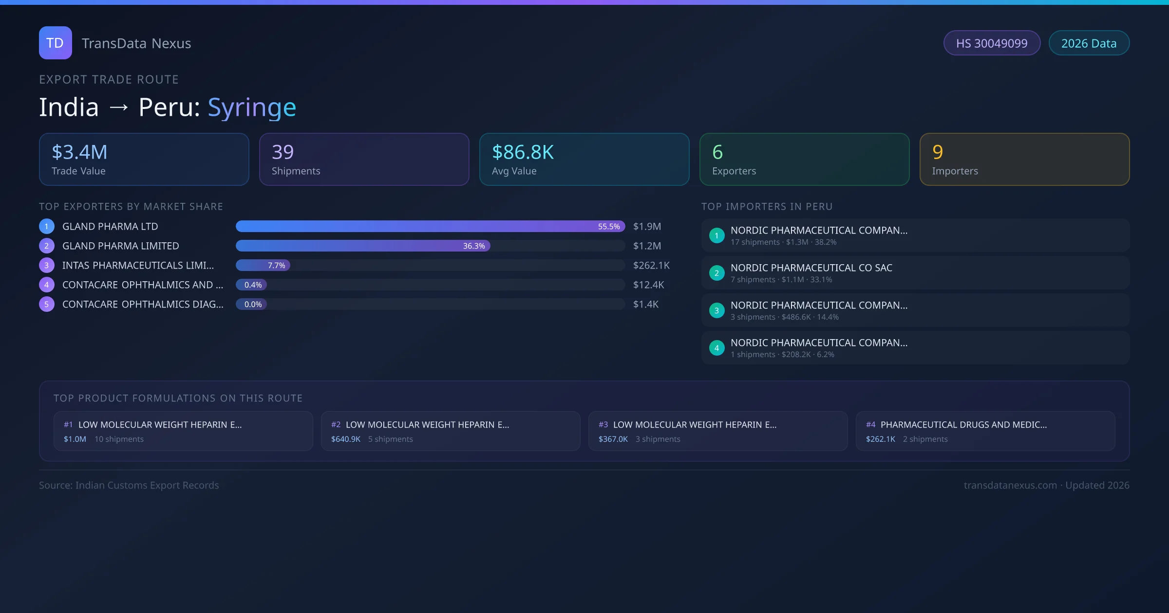 India has recorded 39 verified shipments of Syringe exported to Peru, representing a combined trade value of $3.4M USD. This corridor is served by 6 active Indian exporters, with an average shipment value of $86.8K USD. The leading Indian exporter is GLAND PHARMA LTD, which accounts for 56% of total export value with 18 shipments worth $1.9M USD. On the buying side, NORDIC PHARMACEUTICAL COMPANY SAC is the largest importer in Peru with $1.3M USD in purchases. The top 3 suppliers — GLAND PHARMA LTD, GLAND PHARMA LIMITED, INTAS PHARMACEUTICALS LIMITED — together control 100% of total trade value on this route. All data sourced from Indian Customs (DGFT) shipping bill records. Values reported in FOB USD.