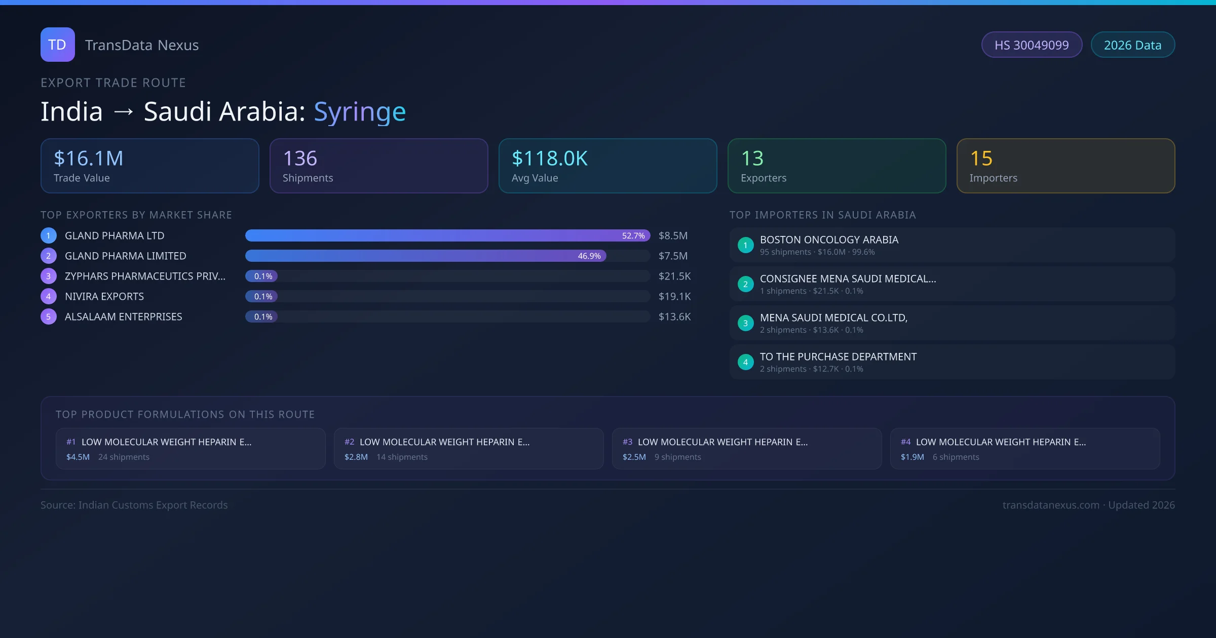 The India to Saudi Arabia Syringe corridor is one of India's established pharmaceutical export routes, with 136 shipments documented worth a combined $16.1M USD. The route is dominated by GLAND PHARMA LTD, which alone accounts for roughly 53% of all export value, reflecting the consolidated nature of India's syringe manufacturing sector.