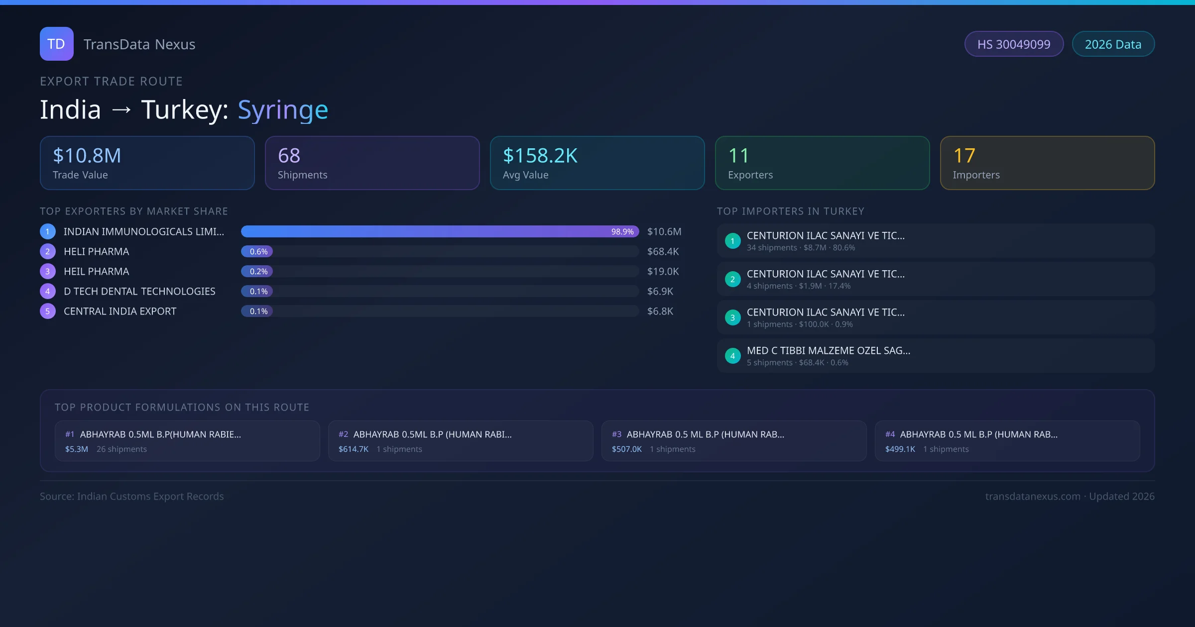 India has recorded 68 verified shipments of Syringe exported to Turkey, representing a combined trade value of $10.8M USD. This corridor is served by 11 active Indian exporters, with an average shipment value of $158.2K USD. The leading Indian exporter is INDIAN IMMUNOLOGICALS LIMITED, which accounts for 99% of total export value with 39 shipments worth $10.6M USD. On the buying side, CENTURION ILAC SANAYI VE TICARET AN is the largest importer in Turkey with $8.7M USD in purchases. The top 3 suppliers — INDIAN IMMUNOLOGICALS LIMITED, HELI PHARMA, HEIL PHARMA — together control 100% of total trade value on this route. All data sourced from Indian Customs (DGFT) shipping bill records. Values reported in FOB USD.