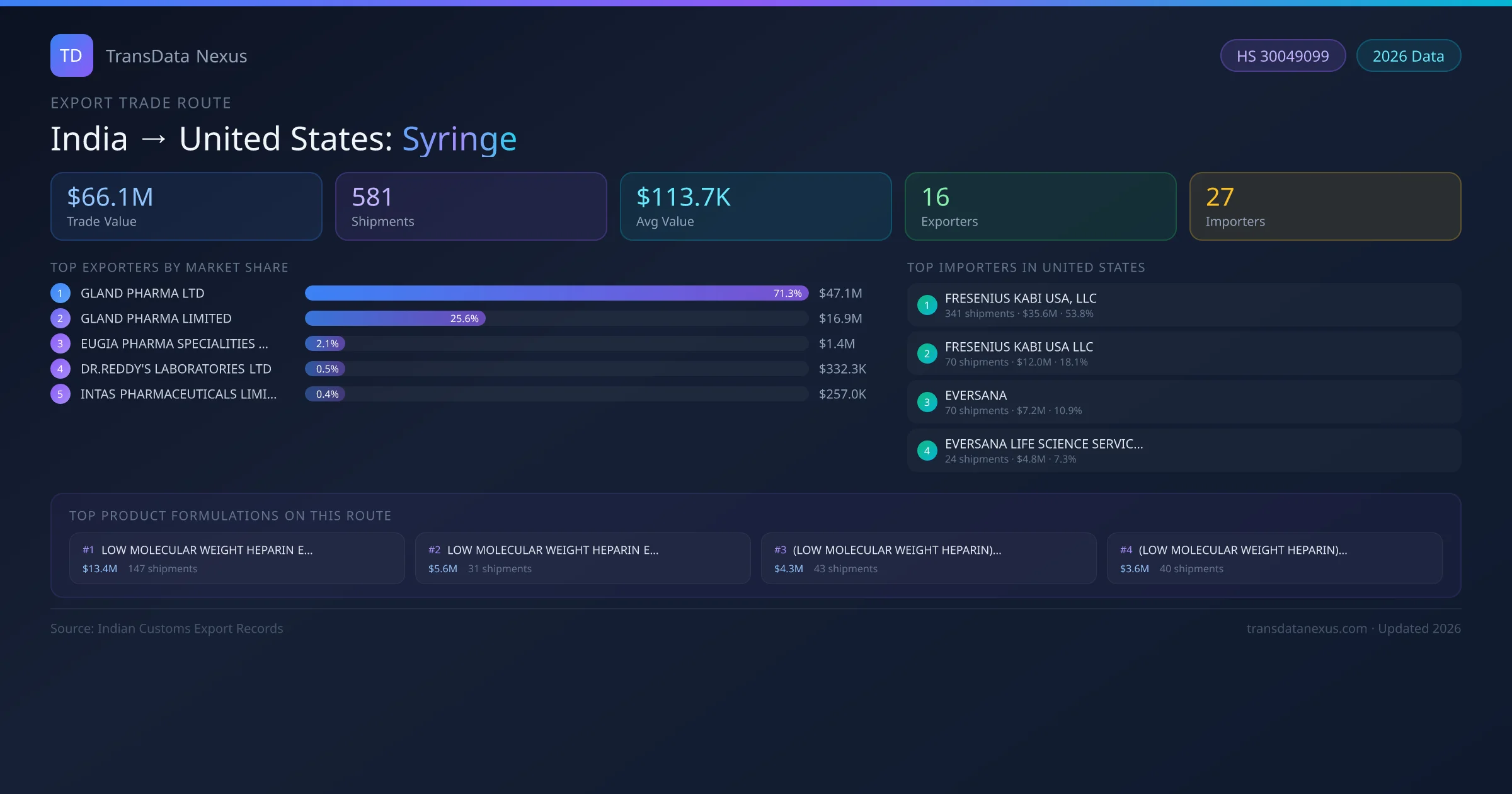 The India to United States Syringe corridor is one of India's established pharmaceutical export routes, with 581 shipments documented worth a combined $66.1M USD. The route is dominated by GLAND PHARMA LTD, which alone accounts for roughly 71% of all export value, reflecting the consolidated nature of India's syringe manufacturing sector.