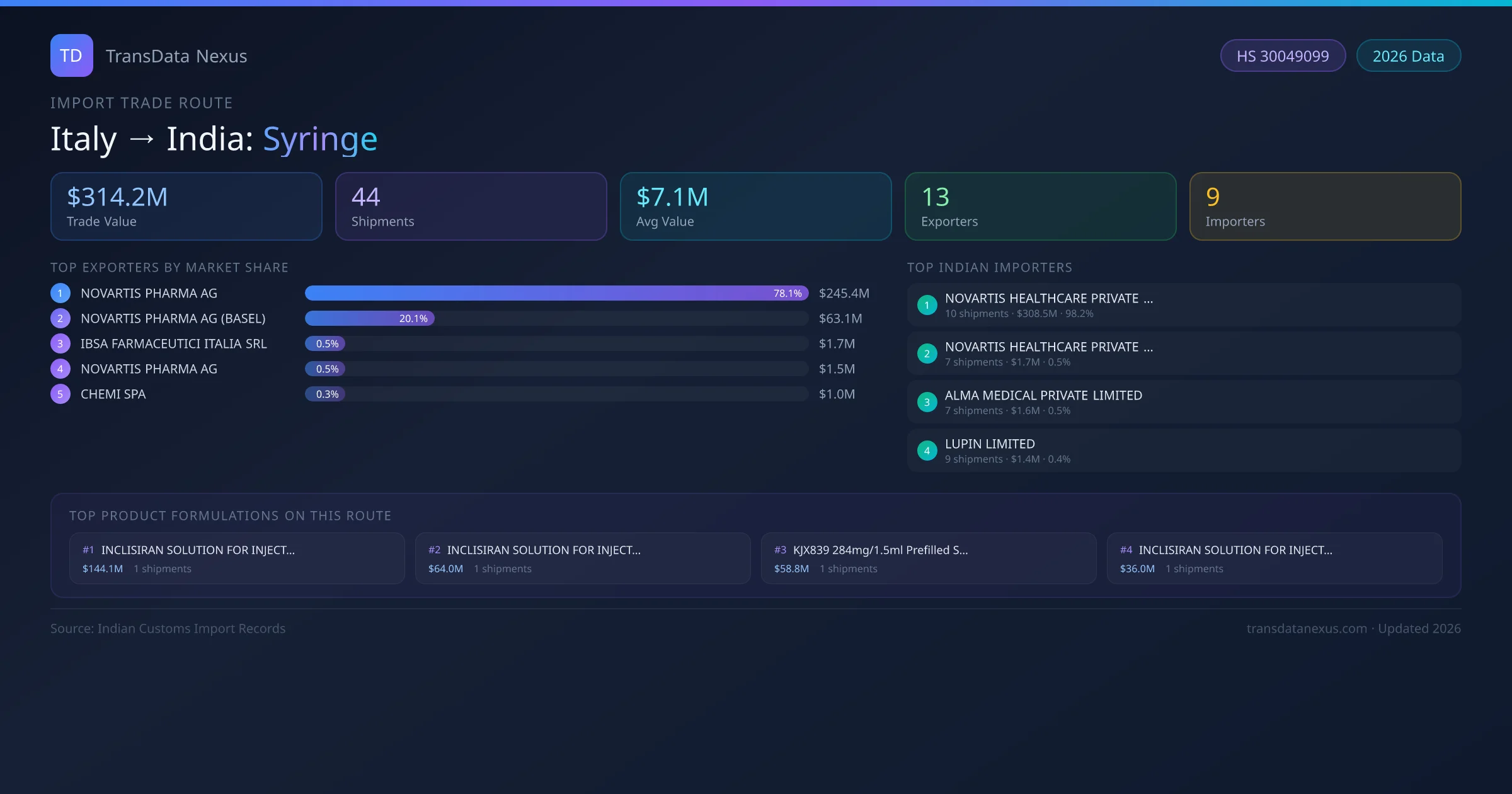 India has recorded 44 verified shipments of Syringe imported from Italy, representing a combined trade value of $314.2M USD. This corridor is served by 13 active Italy exporters, with an average shipment value of $7.1M USD. The leading Italy supplier is NOVARTIS PHARMA AG , which accounts for 78% of total import value with 6 shipments worth $245.4M USD. On the buying side, NOVARTIS HEALTHCARE PRIVATE LIMITED is the largest Indian importer with $308.5M USD in purchases. The top 3 suppliers — NOVARTIS PHARMA AG , NOVARTIS PHARMA AG (BASEL) , IBSA FARMACEUTICI ITALIA SRL — together control 99% of total trade value on this route. All data sourced from Indian Customs (DGFT) shipping bill of entry records. Values reported in FOB USD.