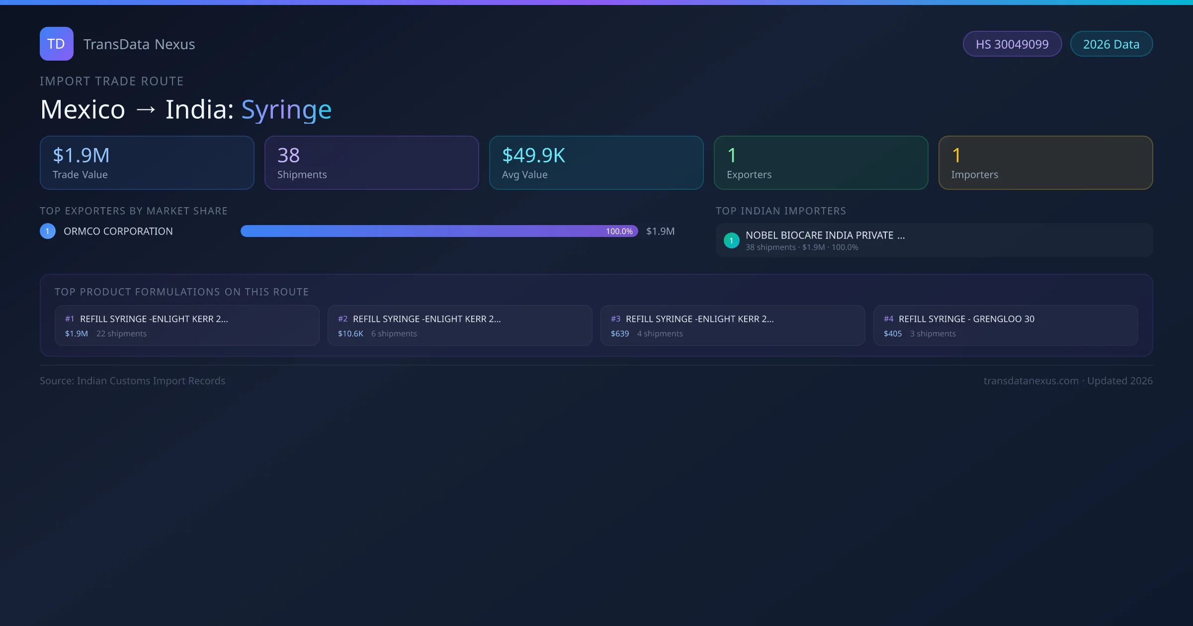On the receiving end of this trade route, the leading Indian importers of Mexico syringe include NOBEL BIOCARE INDIA PRIVATE LIMITED . The largest importer is NOBEL BIOCARE INDIA PRIVATE LIMITED , accounting for $1.9M USD across 38 shipments — representing 100% of all syringe imports from Mexico on this route.