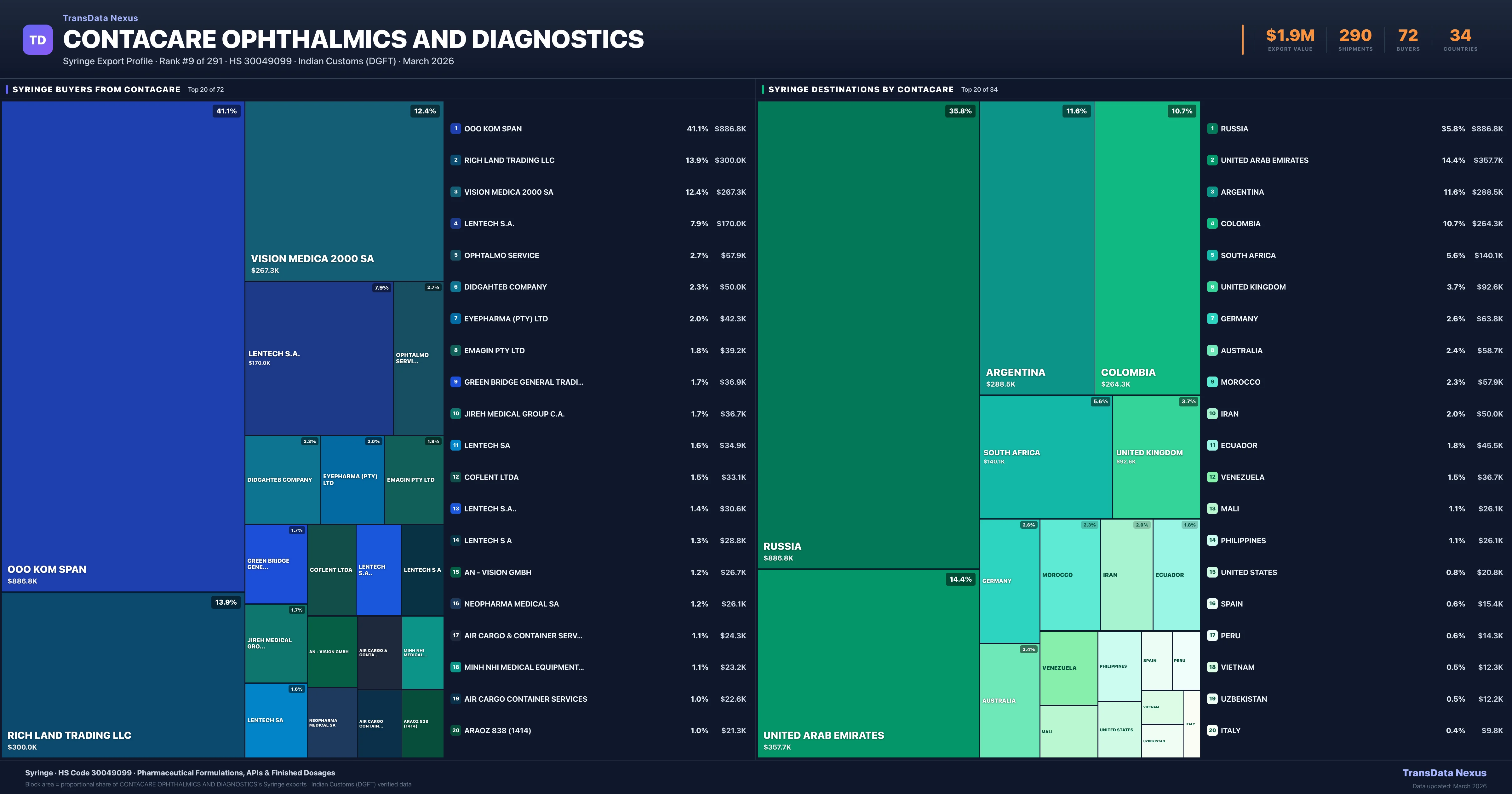 Contacare Ophthalmics AND Diagnostics supplies Syringe to 72 buyers globally. The largest buyer is OOO KOM SPAN (RUSSIA), followed by RICH LAND TRADING LLC (UNITED ARAB EMIRATES) and VISION MEDICA 2000 SA (ARGENTINA). These buyers represent pharmaceutical distributors, hospital groups, and government procurement agencies in their respective markets.