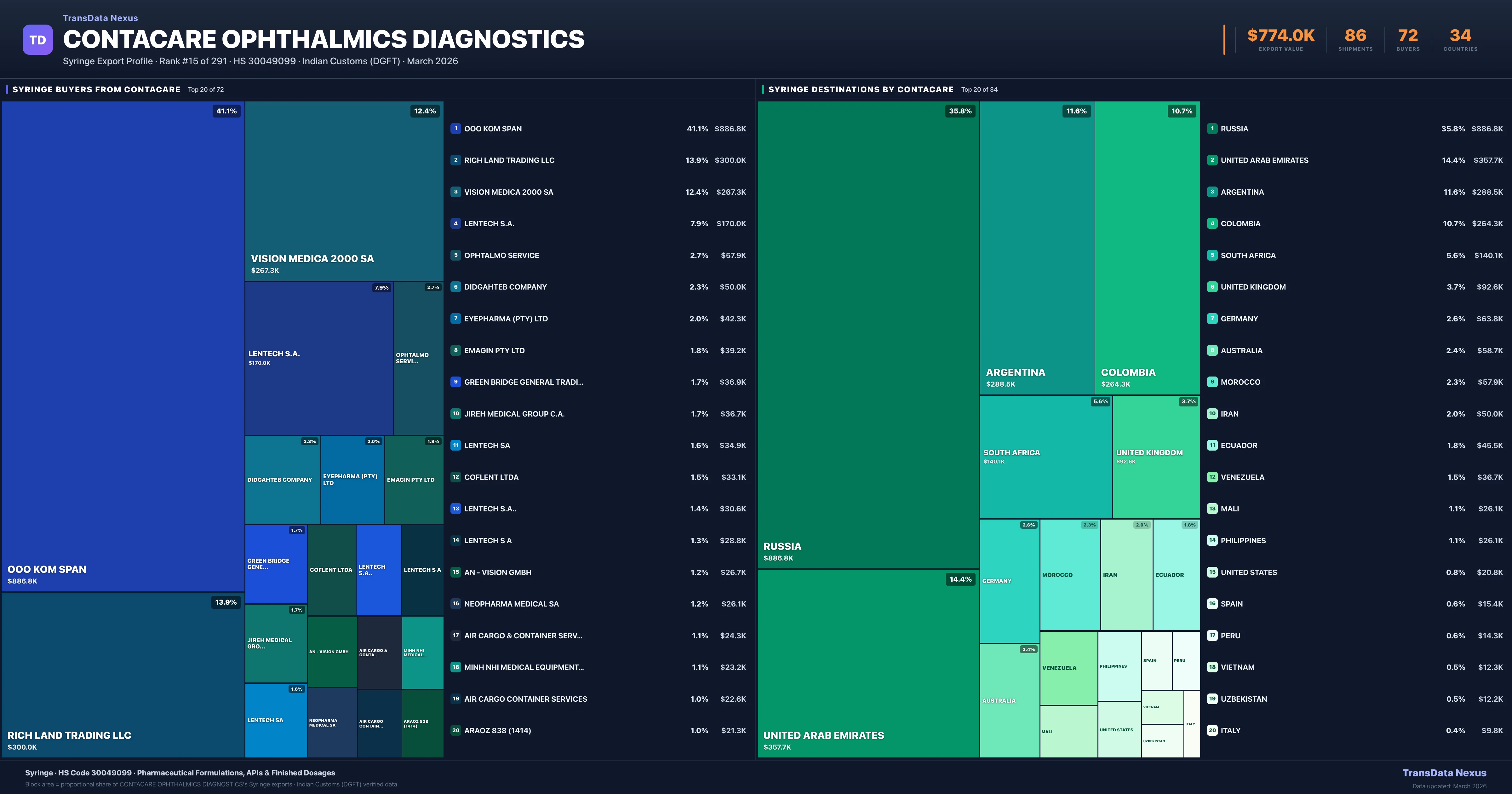 Contacare Ophthalmics Diagnostics supplies Syringe to 72 buyers globally. The largest buyer is OOO KOM SPAN (RUSSIA), followed by RICH LAND TRADING LLC (UNITED ARAB EMIRATES) and VISION MEDICA 2000 SA (ARGENTINA). These buyers represent pharmaceutical distributors, hospital groups, and government procurement agencies in their respective markets.