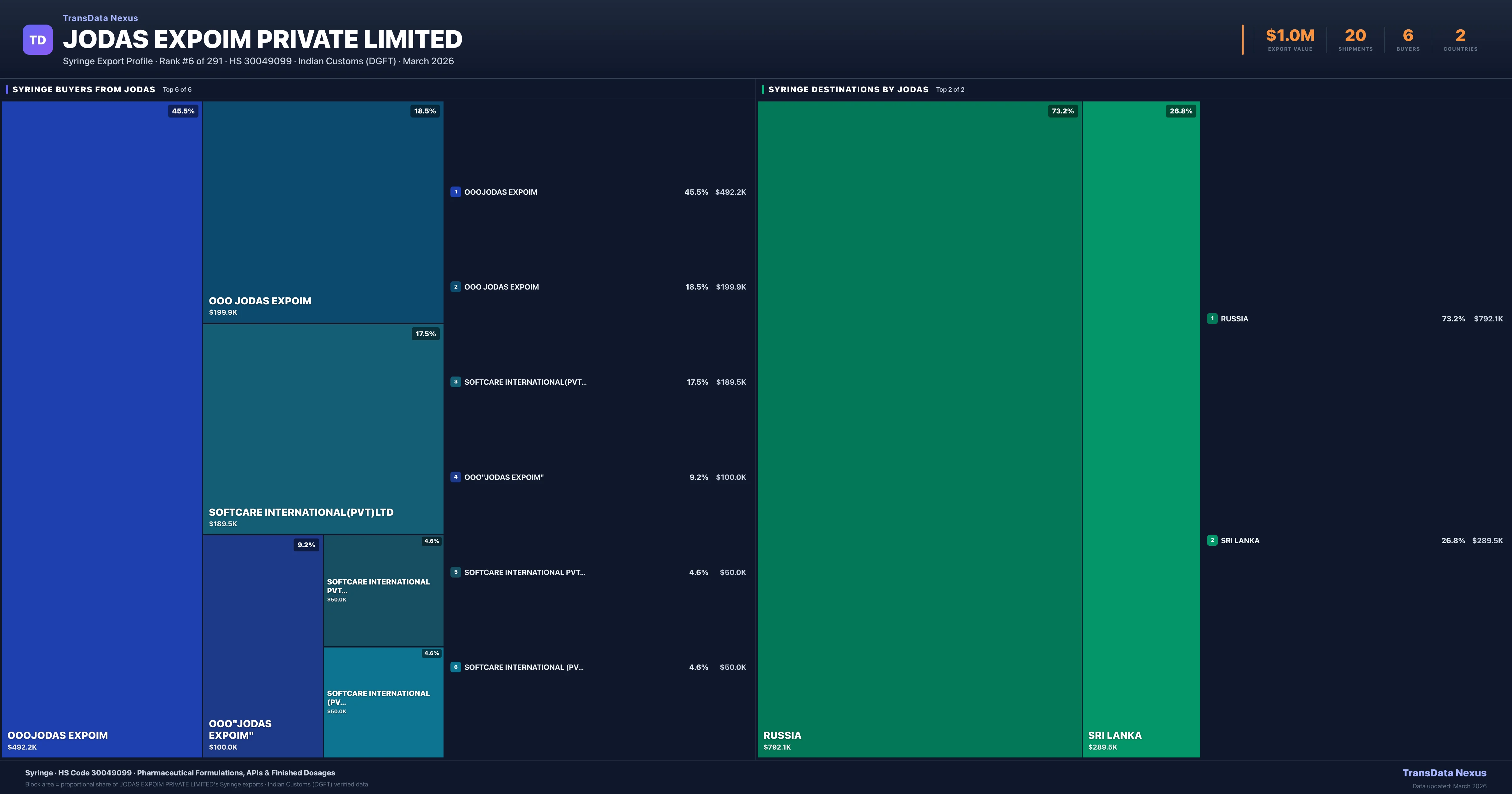 Jodas Expoim Private Limited supplies Syringe to 6 buyers globally. The largest buyer is OOOJODAS EXPOIM (RUSSIA), followed by OOO JODAS EXPOIM (RUSSIA) and SOFTCARE INTERNATIONAL(PVT)LTD (SRI LANKA). These buyers represent pharmaceutical distributors, hospital groups, and government procurement agencies in their respective markets.
