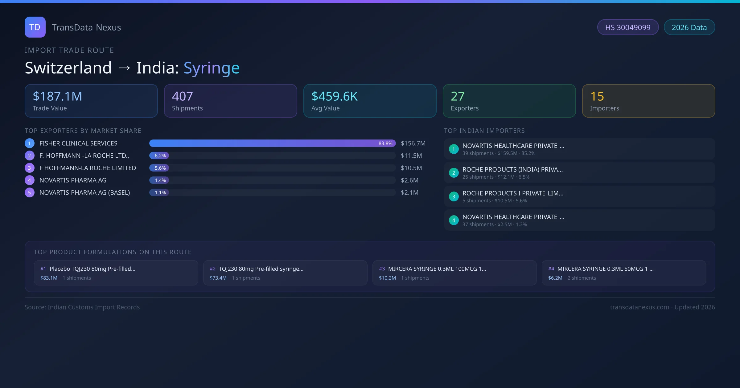 India has recorded 407 verified shipments of Syringe imported from Switzerland, representing a combined trade value of $187.1M USD. This corridor is served by 27 active Switzerland exporters, with an average shipment value of $459.6K USD. The leading Switzerland supplier is FISHER CLINICAL SERVICES , which accounts for 84% of total import value with 6 shipments worth $156.7M USD. On the buying side, NOVARTIS HEALTHCARE PRIVATE LIMITED is the largest Indian importer with $159.5M USD in purchases. The top 3 suppliers — FISHER CLINICAL SERVICES , F. HOFFMANN -LA ROCHE LTD., , F HOFFMANN-LA ROCHE LIMITED — together control 96% of total trade value on this route. All data sourced from Indian Customs (DGFT) shipping bill of entry records. Values reported in FOB USD.