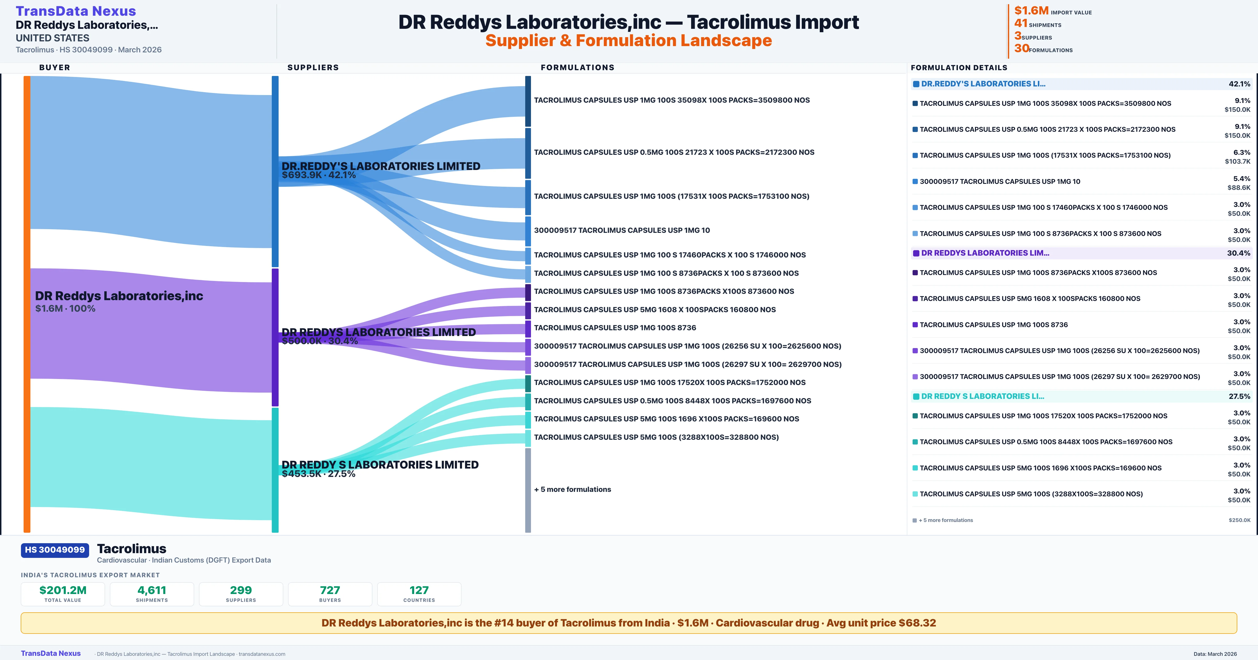 DR REDDYS LABORATORIES INC sources Tacrolimus from 3 verified Indian suppliers: DR.REDDY'S LABORATORIES LIMITED ($693.9K, 42.1%), DR REDDYS LABORATORIES LIMITED ($500.0K, 30.4%), DR REDDY S LABORATORIES LIMITED ($453.5K, 27.5%). This is based on 41 customs records.