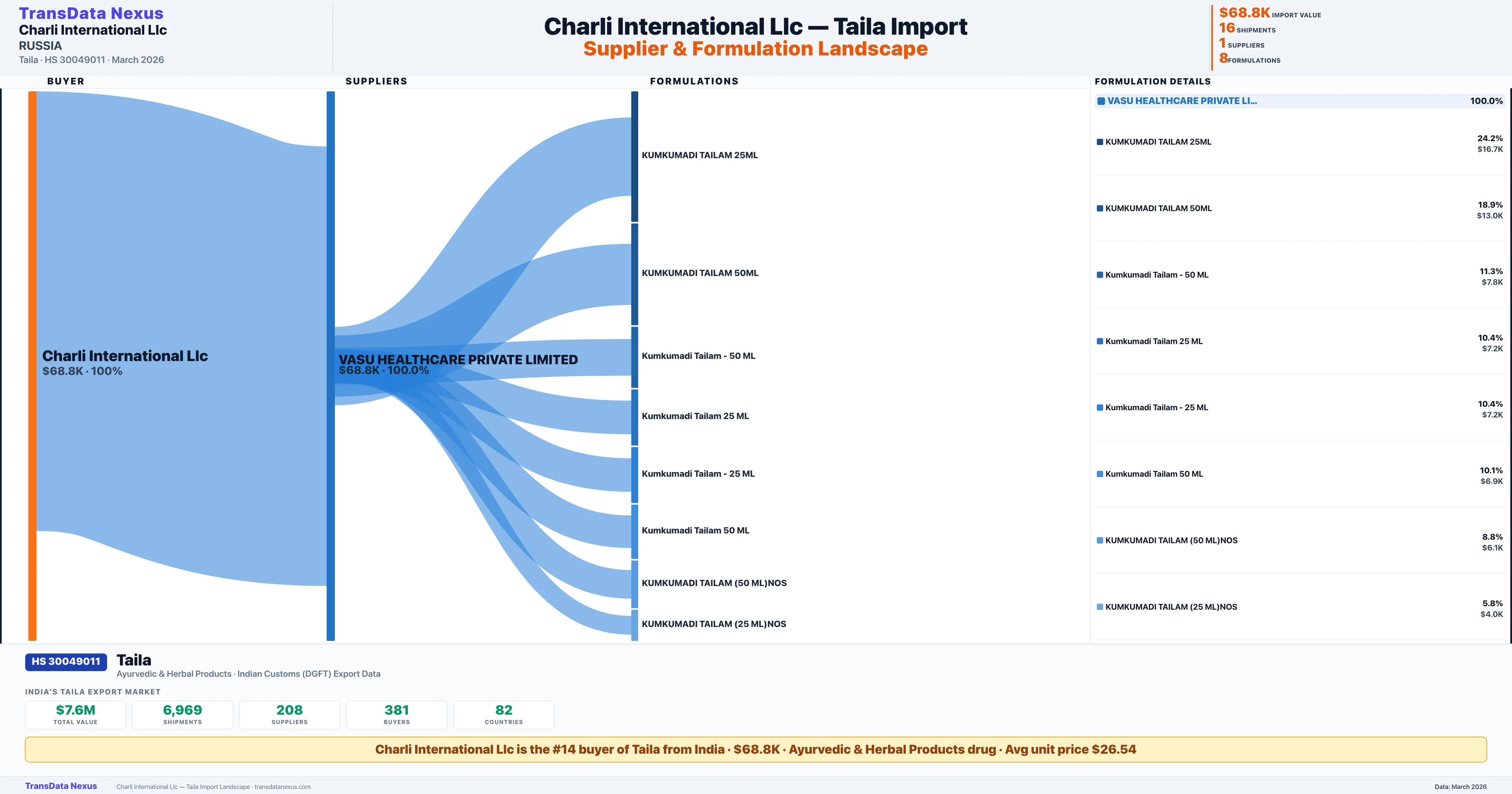 CHARLI INTERNATIONAL LLC imports 8 distinct Taila formulations from India. The top formulation is KUMKUMADI TAILAM 25ML with 5 shipments worth $16.7K.