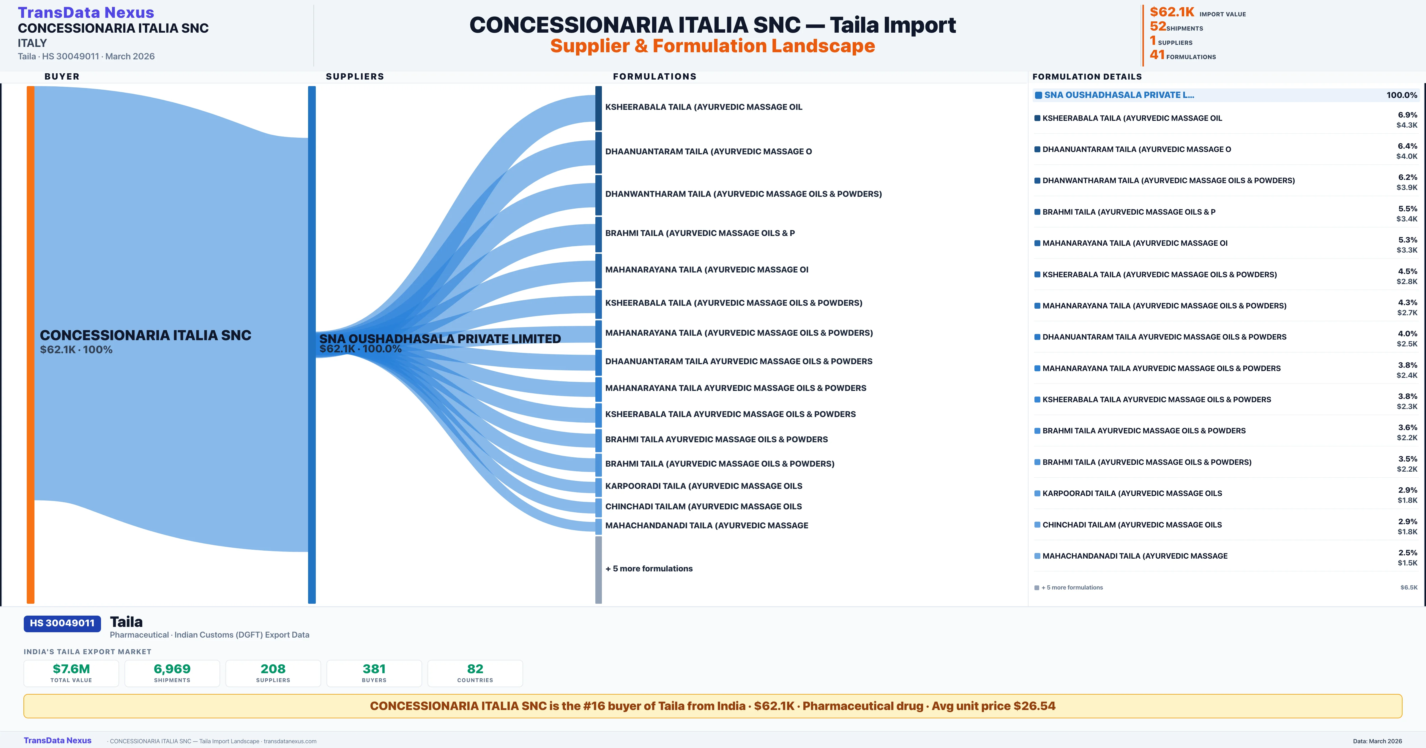CONCESSIONARIA ITALIA SNC sources Taila from 1 verified Indian supplier: SNA OUSHADHASALA PRIVATE LIMITED ($62.1K, 100.0%). This is based on 52 customs records.