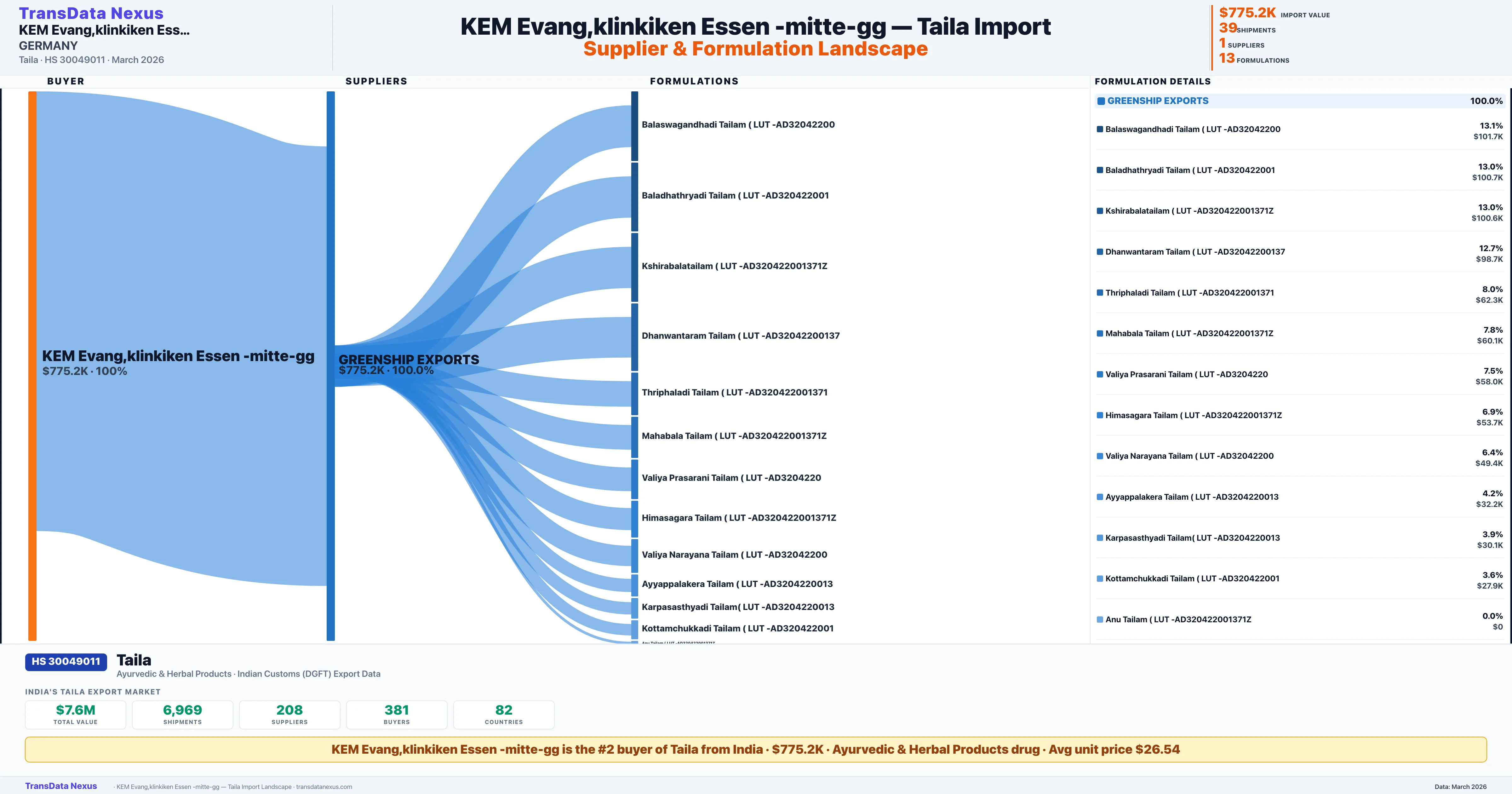 KEM EVANG,KLINKIKEN ESSEN -MITTE-GG imports 13 distinct Taila formulations from India. The top formulation is Balaswagandhadi Tailam ( LUT -AD32042200 with 3 shipments worth $101.7K.