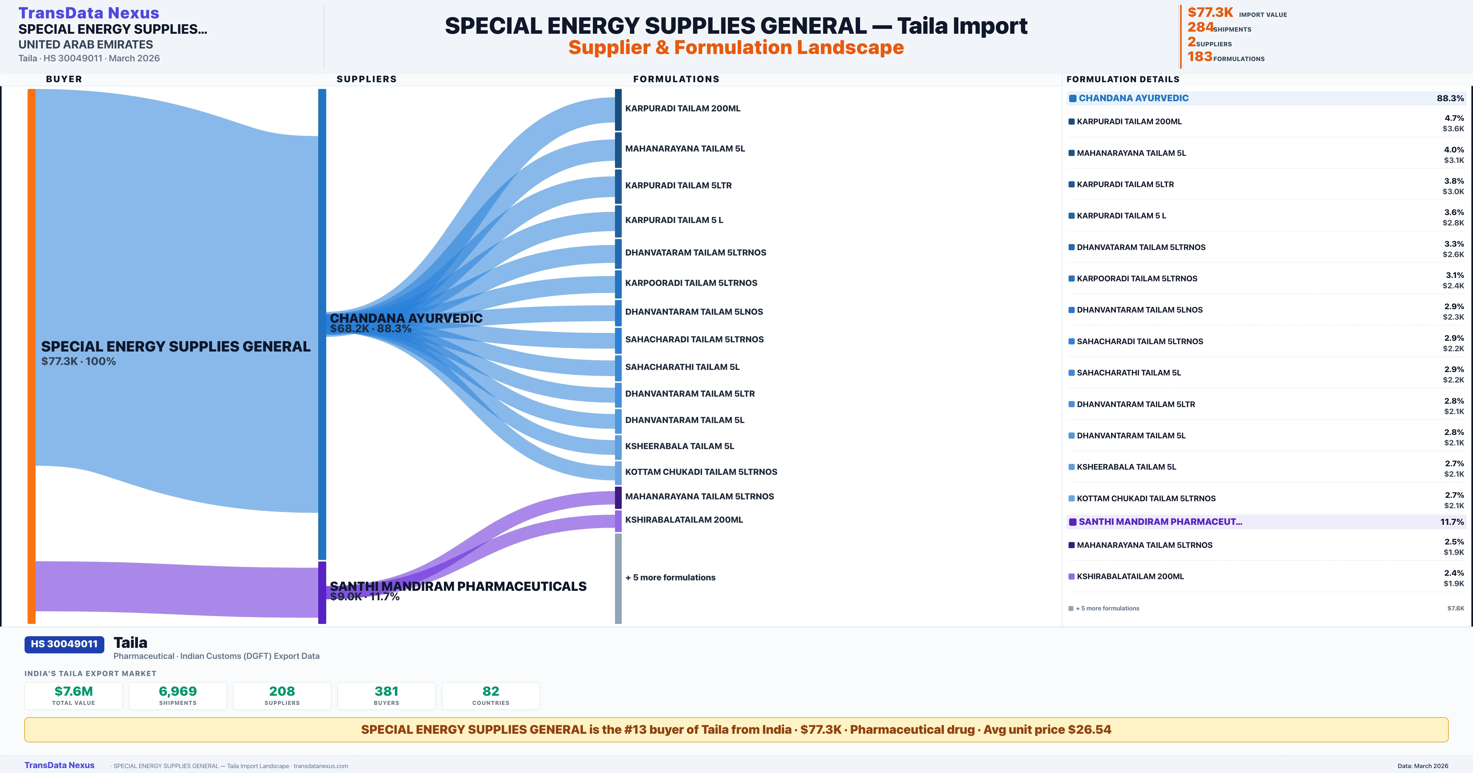 SPECIAL ENERGY SUPPLIES GENERAL sources Taila from 2 verified Indian suppliers: CHANDANA AYURVEDIC ($68.2K, 88.3%), SANTHI MANDIRAM PHARMACEUTICALS ($9.0K, 11.7%). This is based on 284 customs records.