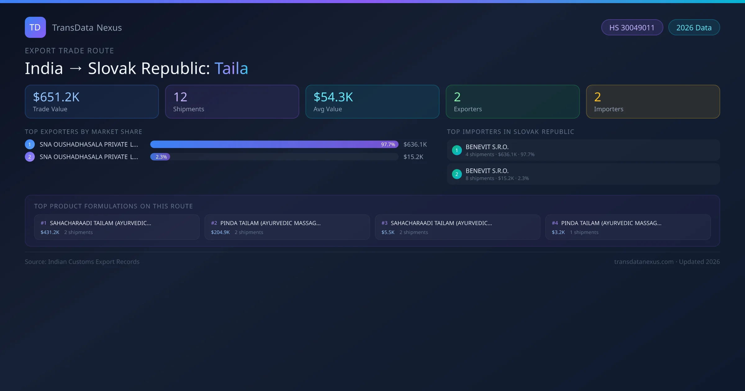 India has recorded 12 verified shipments of Taila exported to Slovak Republic, representing a combined trade value of $651.2K USD. This corridor is served by 2 active Indian exporters, with an average shipment value of $54.3K USD. The leading Indian exporter is SNA OUSHADHASALA PRIVATE LIMITED, which accounts for 98% of total export value with 4 shipments worth $636.1K USD. On the buying side, BENEVIT S.R.O. is the largest importer in Slovak Republic with $636.1K USD in purchases. All data sourced from Indian Customs (DGFT) shipping bill records. Values reported in FOB USD.