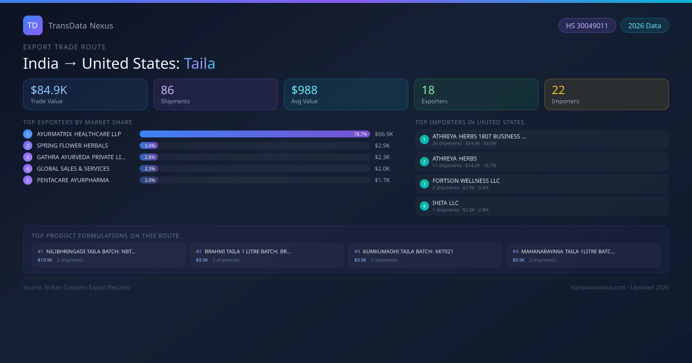 The India to United States Taila corridor is one of India's established pharmaceutical export routes, with 86 shipments documented worth a combined $84.9K USD. The route is dominated by AYURMATRIX HEALTHCARE LLP, which alone accounts for roughly 79% of all export value, reflecting the consolidated nature of India's taila manufacturing sector.