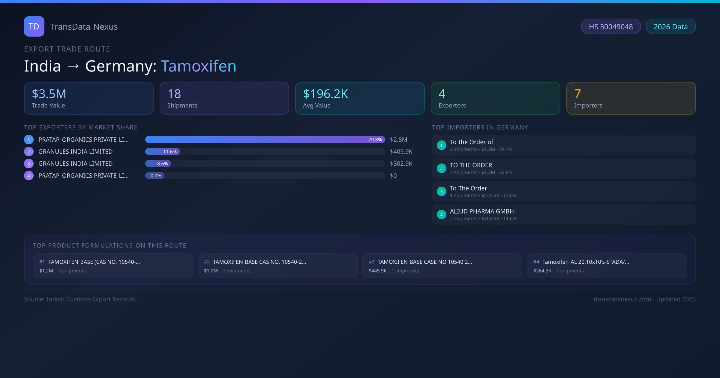 - 1.Route Identification: India to Germany export trade corridor identified from Indian Customs (DGFT) records for Tamoxifen.