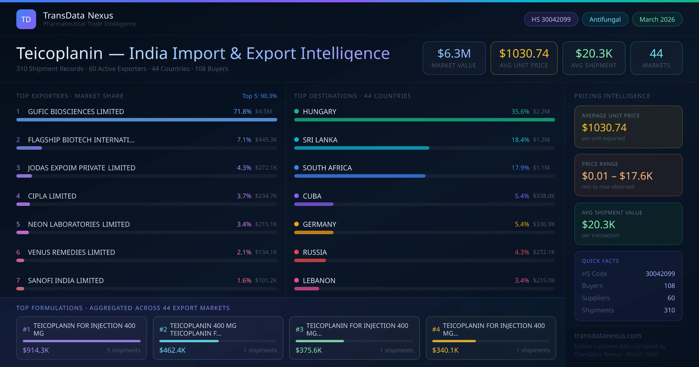 Between 2022 and 2026, India exported $6.3M worth of teicoplanin across 310 verified shipments to 44 countries — covering 23% of world markets in the Advanced Antibiotics segment. The largest destination is HUNGARY (35.6%). GUFIC BIOSCIENCES LIMITED leads with a 71.8% share. All figures are drawn from Indian Customs (DGFT) shipping bill records spanning four years of trade activity.