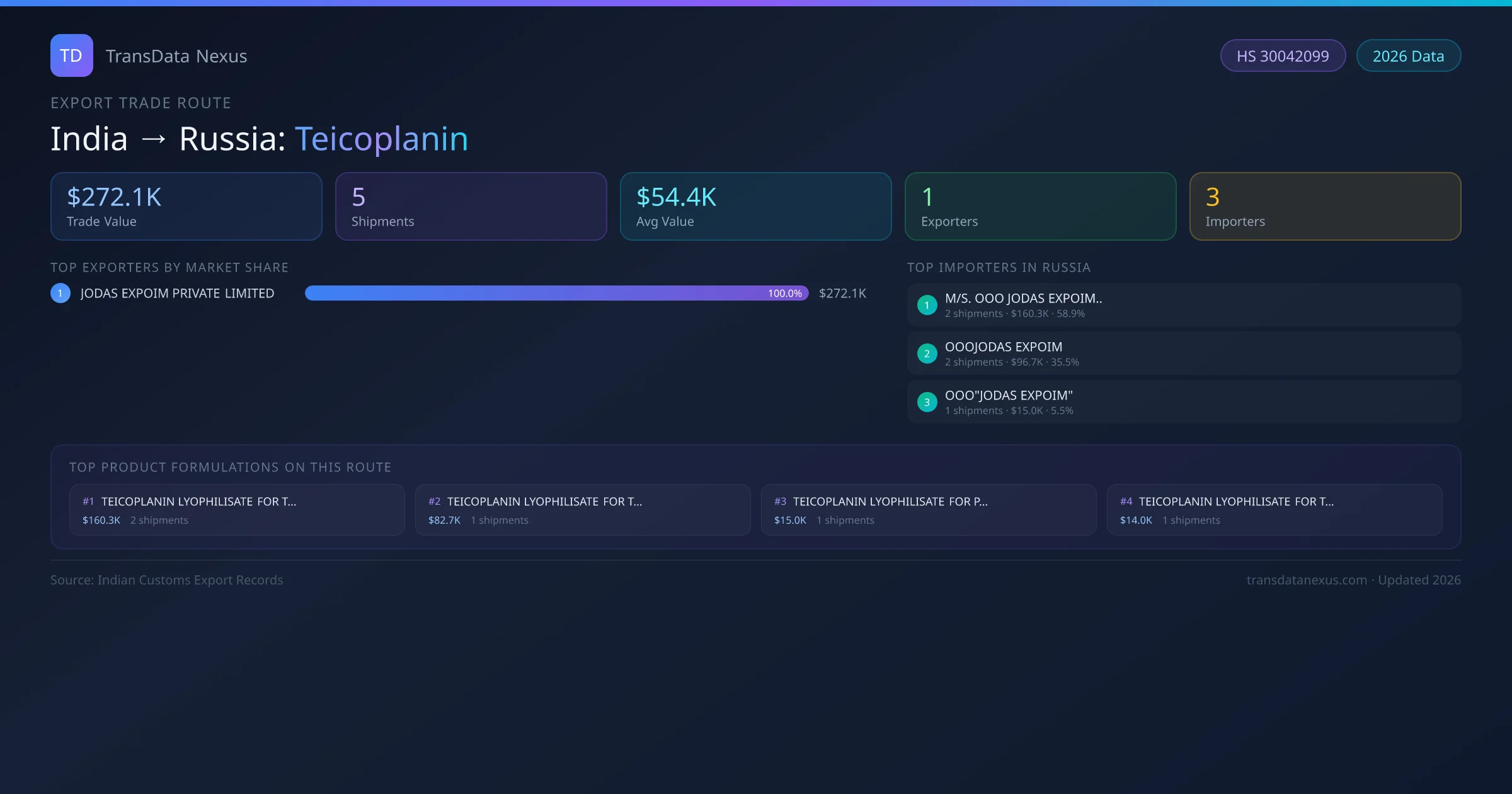 India has recorded 5 verified shipments of Teicoplanin exported to Russia, representing a combined trade value of $272.1K USD. This corridor is served by 1 active Indian exporters, with an average shipment value of $54.4K USD. The leading Indian exporter is JODAS EXPOIM PRIVATE LIMITED, which accounts for 100% of total export value with 5 shipments worth $272.1K USD. On the buying side, M/S. OOO JODAS EXPOIM.. is the largest importer in Russia with $160.3K USD in purchases. All data sourced from Indian Customs (DGFT) shipping bill records. Values reported in FOB USD.