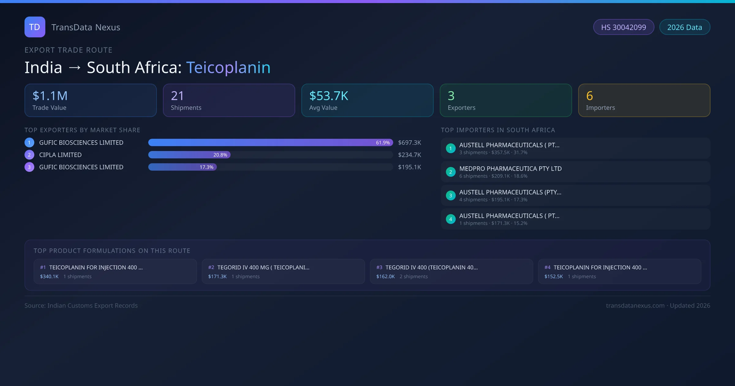 - 1.Route Identification: India to South Africa export trade corridor identified from Indian Customs (DGFT) records for Teicoplanin.