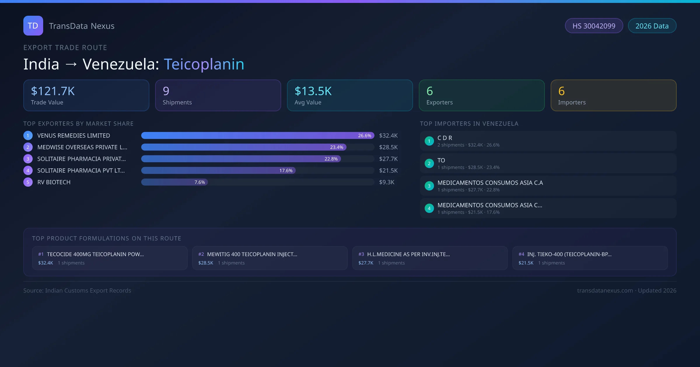 The leading Indian exporters of Teicoplanin to Venezuela are VENUS REMEDIES LIMITED, MEDWISE OVERSEAS PRIVATE LIMITED, SOLITAIRE PHARMACIA PRIVATE LIMITED. VENUS REMEDIES LIMITED holds the largest market share at approximately 27% of total trade value on this route.