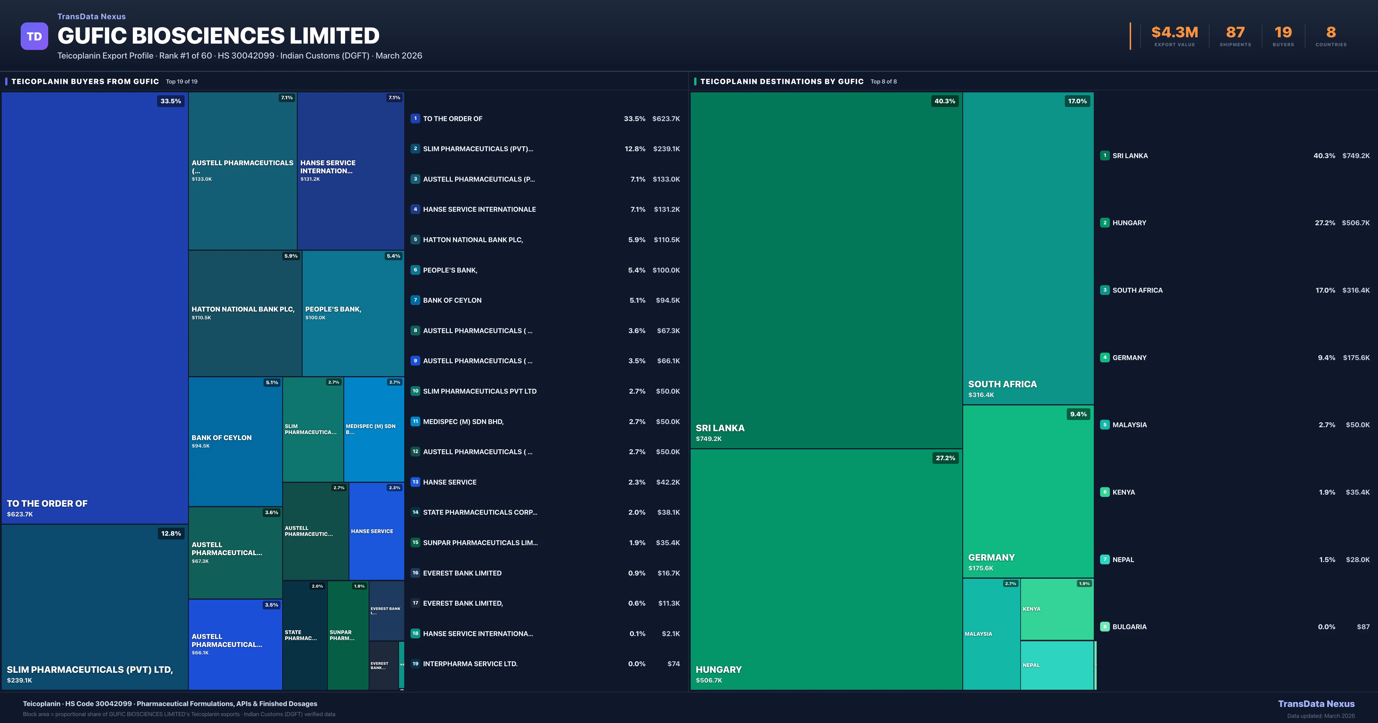 Gufic Biosciences Limited supplies Teicoplanin to 19 buyers globally. The largest buyer is TO THE ORDER OF (SRI LANKA), followed by SLIM PHARMACEUTICALS (PVT) LTD, (SRI LANKA) and AUSTELL PHARMACEUTICALS (PTY) LTD, (SOUTH AFRICA). These buyers represent pharmaceutical distributors, hospital groups, and government procurement agencies in their respective markets.