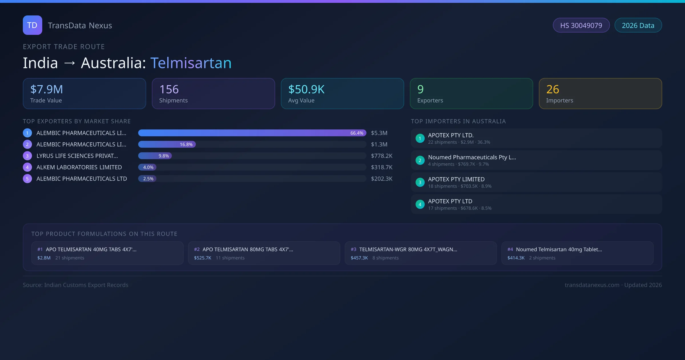 India has recorded 156 verified shipments of Telmisartan exported to Australia, representing a combined trade value of $7.9M USD. This corridor is served by 9 active Indian exporters, with an average shipment value of $50.9K USD. The leading Indian exporter is ALEMBIC PHARMACEUTICALS LIMITED, which accounts for 66% of total export value with 98 shipments worth $5.3M USD. On the buying side, APOTEX PTY LTD. is the largest importer in Australia with $2.9M USD in purchases. The top 3 suppliers — ALEMBIC PHARMACEUTICALS LIMITED, ALEMBIC PHARMACEUTICALS LIMITED , LYRUS LIFE SCIENCES PRIVATE LIMITED — together control 93% of total trade value on this route. All data sourced from Indian Customs (DGFT) shipping bill records. Values reported in FOB USD.