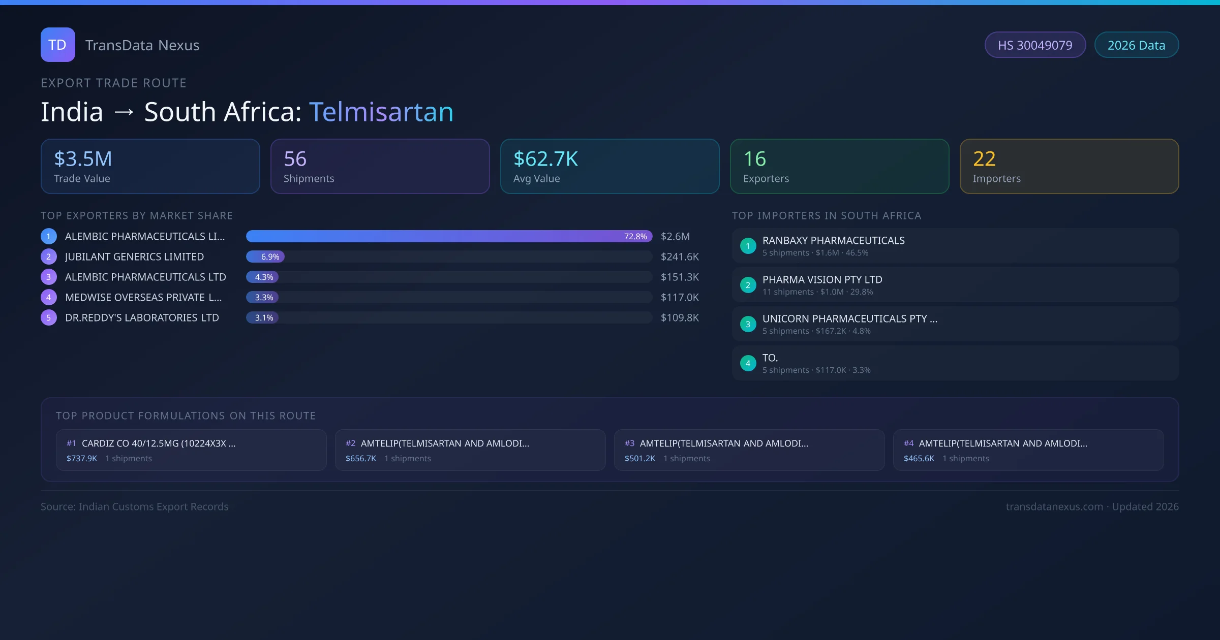 - 1.Route Identification: India to South Africa export trade corridor identified from Indian Customs (DGFT) records for Telmisartan.