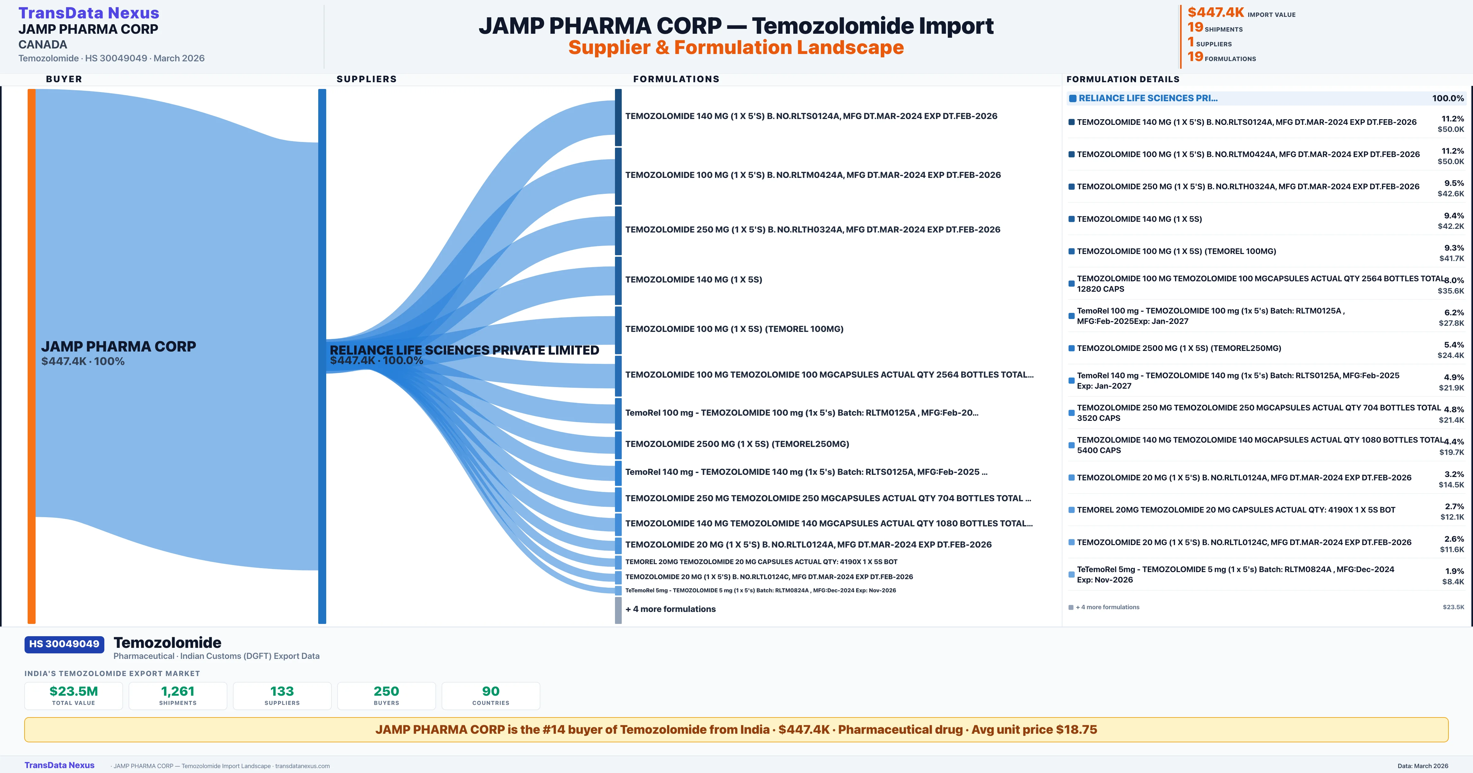 JAMP PHARMA CORP sources Temozolomide from 1 verified Indian supplier based on 19 customs records. The primary supplier is RELIANCE LIFE SCIENCES PRIVATE LIMITED accounting for 100.0% of imports.