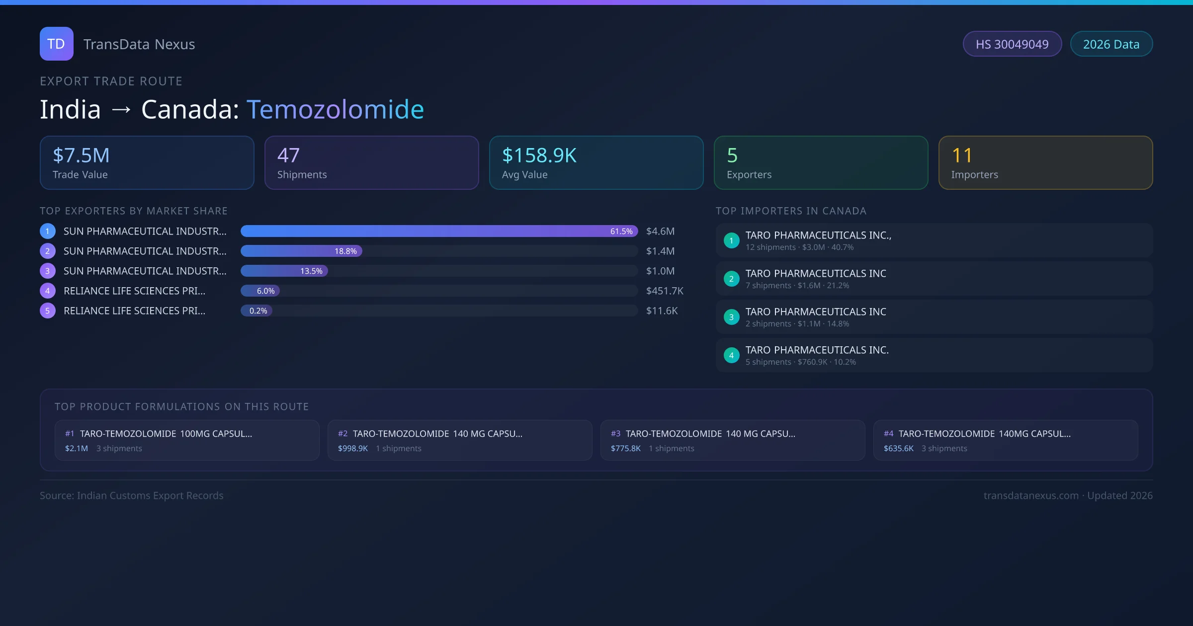 - 1.Route Identification: India to Canada export trade corridor identified from Indian Customs (DGFT) records for Temozolomide.