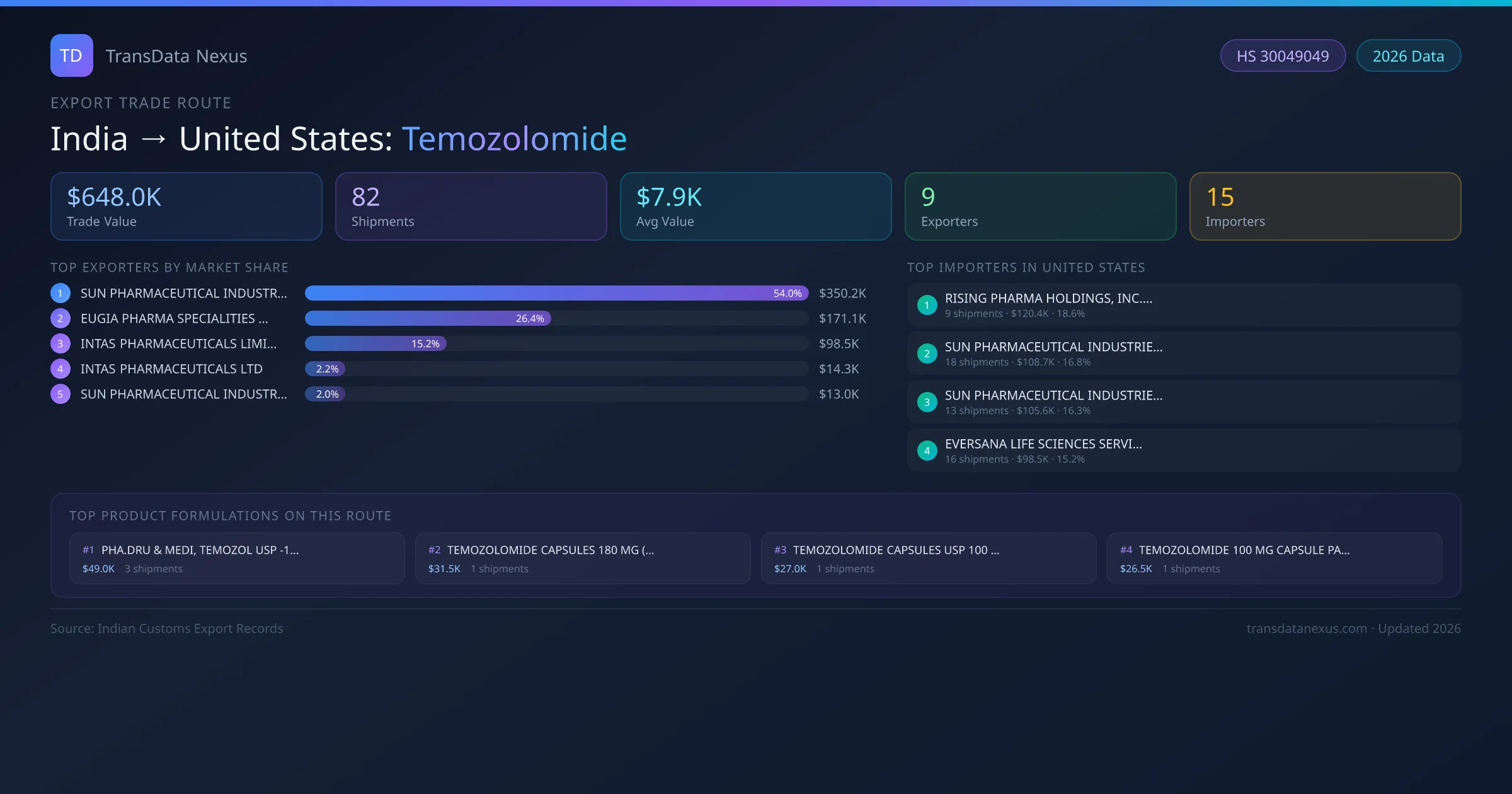 The India to United States Temozolomide corridor is one of India's established pharmaceutical export routes, with 82 shipments documented worth a combined $648.0K USD. The route is dominated by SUN PHARMACEUTICAL INDUSTRIES LIMITED, which alone accounts for roughly 54% of all export value, reflecting the consolidated nature of India's temozolomide manufacturing sector.