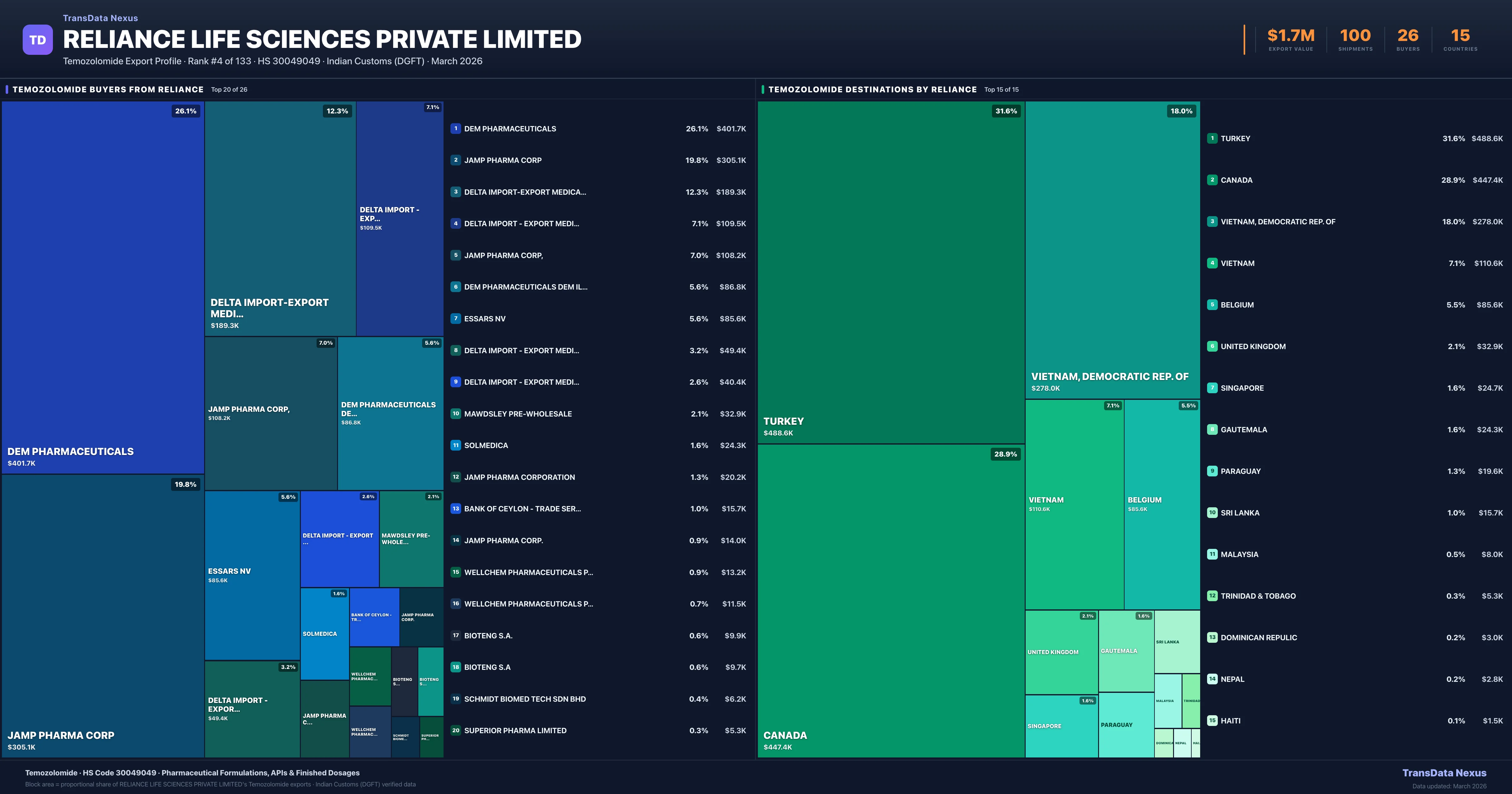 Reliance Life Sciences Private Limited supplies Temozolomide to 26 buyers globally. The largest buyer is DEM PHARMACEUTICALS (TURKEY), followed by JAMP PHARMA CORP (CANADA) and DELTA IMPORT-EXPORT MEDICAL CO.LTD (VIETNAM, DEMOCRATIC REP. OF). These buyers represent pharmaceutical distributors, hospital groups, and government procurement agencies in their respective markets.