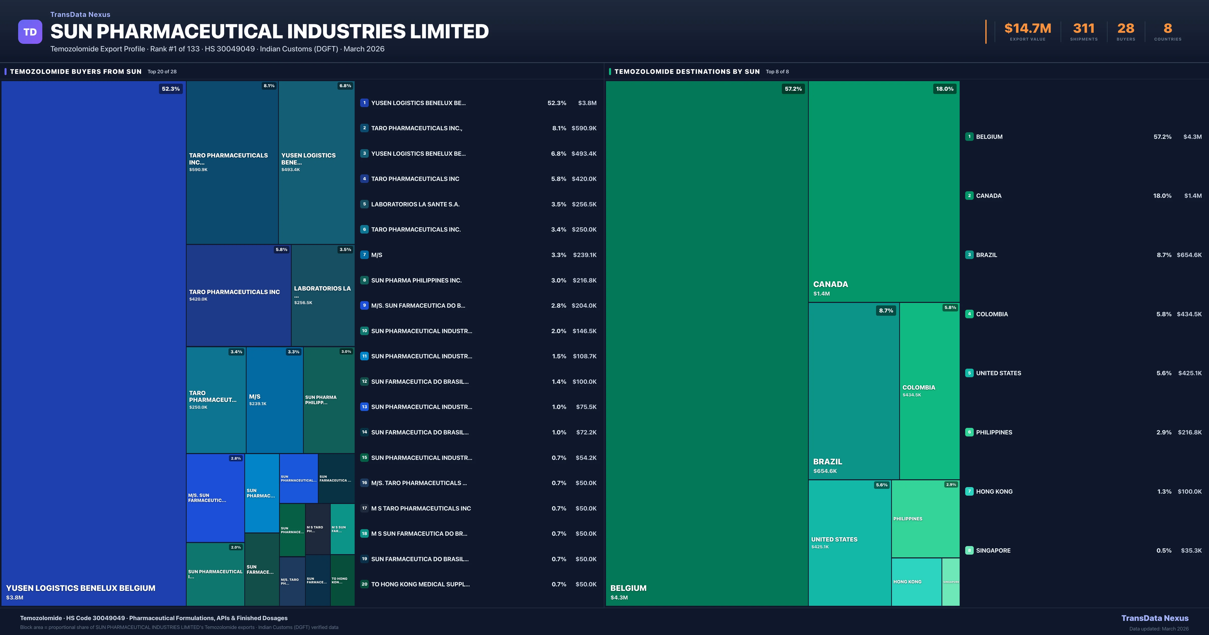 SUN Pharmaceutical Industries Limited — Temozolomide Export Profile: Buyers & Destinations