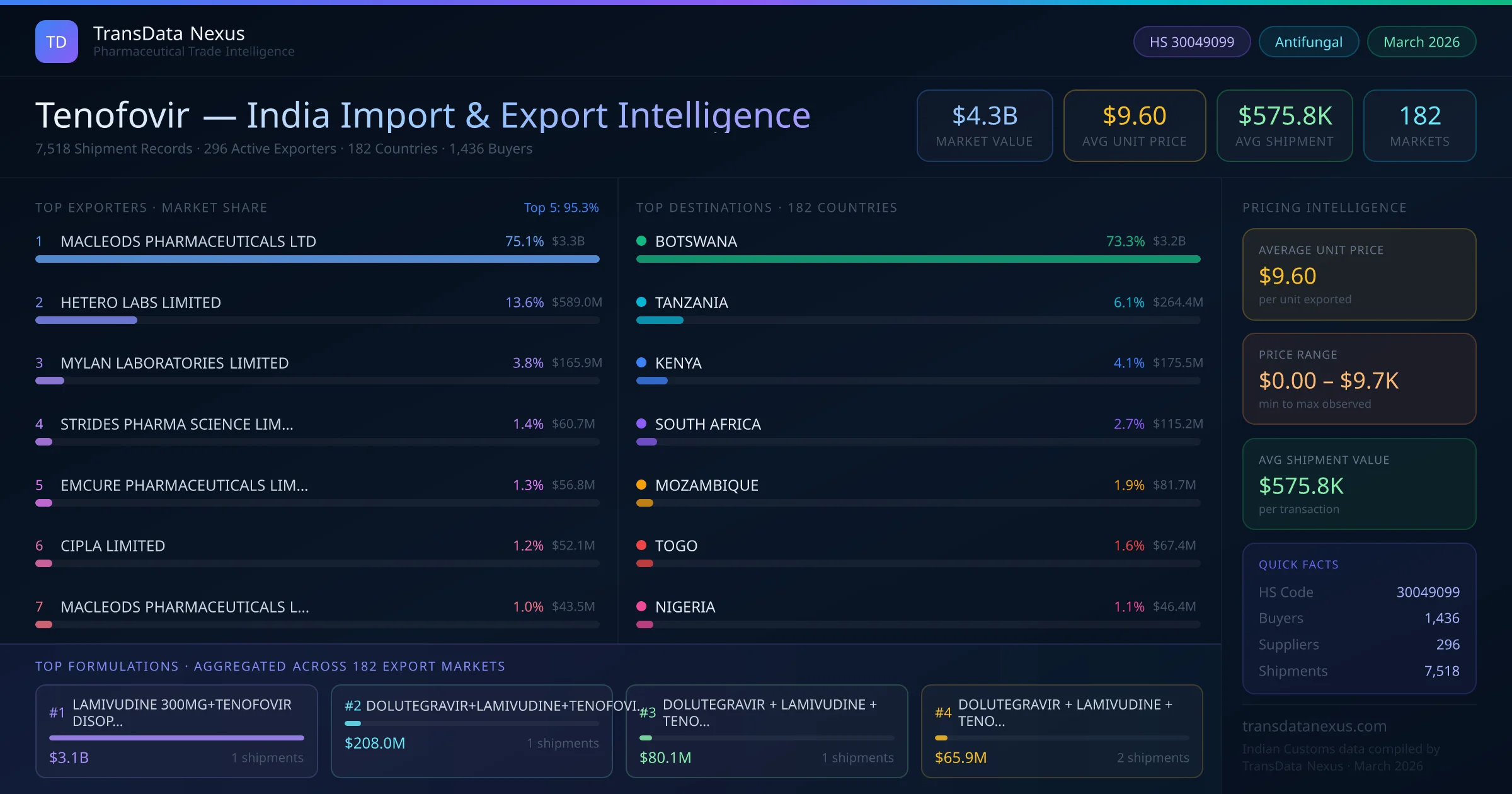 Between 2022 and 2026, India exported $4.3B worth of tenofovir across 7,518 verified shipments to 182 countries — covering 93% of world markets in the Antiviral & HIV Medications segment. The largest destination is BOTSWANA (73.3%). MACLEODS PHARMACEUTICALS LTD leads with a 75.1% share. All figures are drawn from Indian Customs (DGFT) shipping bill records spanning four years of trade activity.
