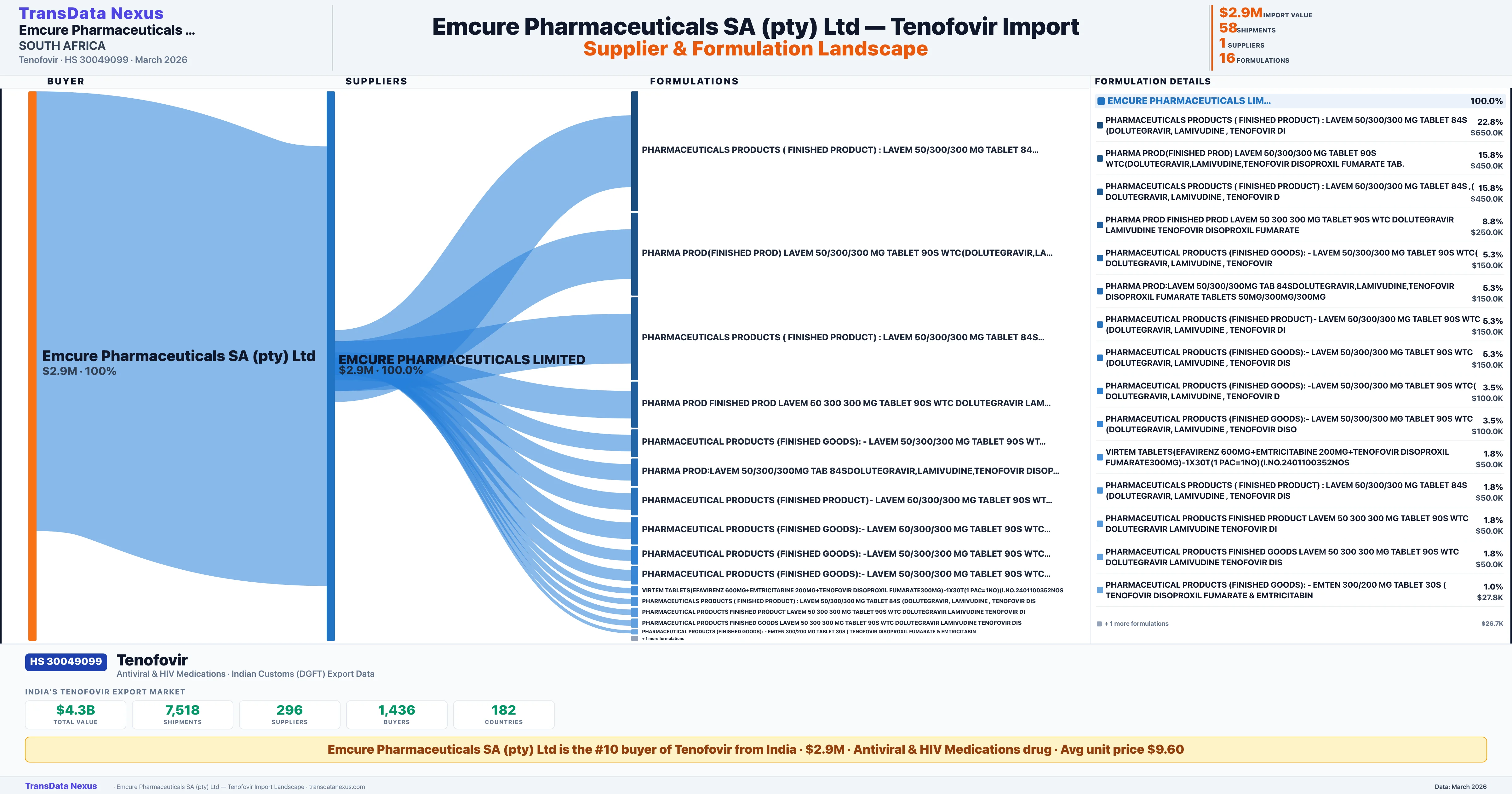 EMCURE PHARMACEUTICALS SA (PTY) LTD sources Tenofovir from 1 verified Indian supplier: EMCURE PHARMACEUTICALS LIMITED ($2.9M, 100.0%). This is based on 58 customs records.