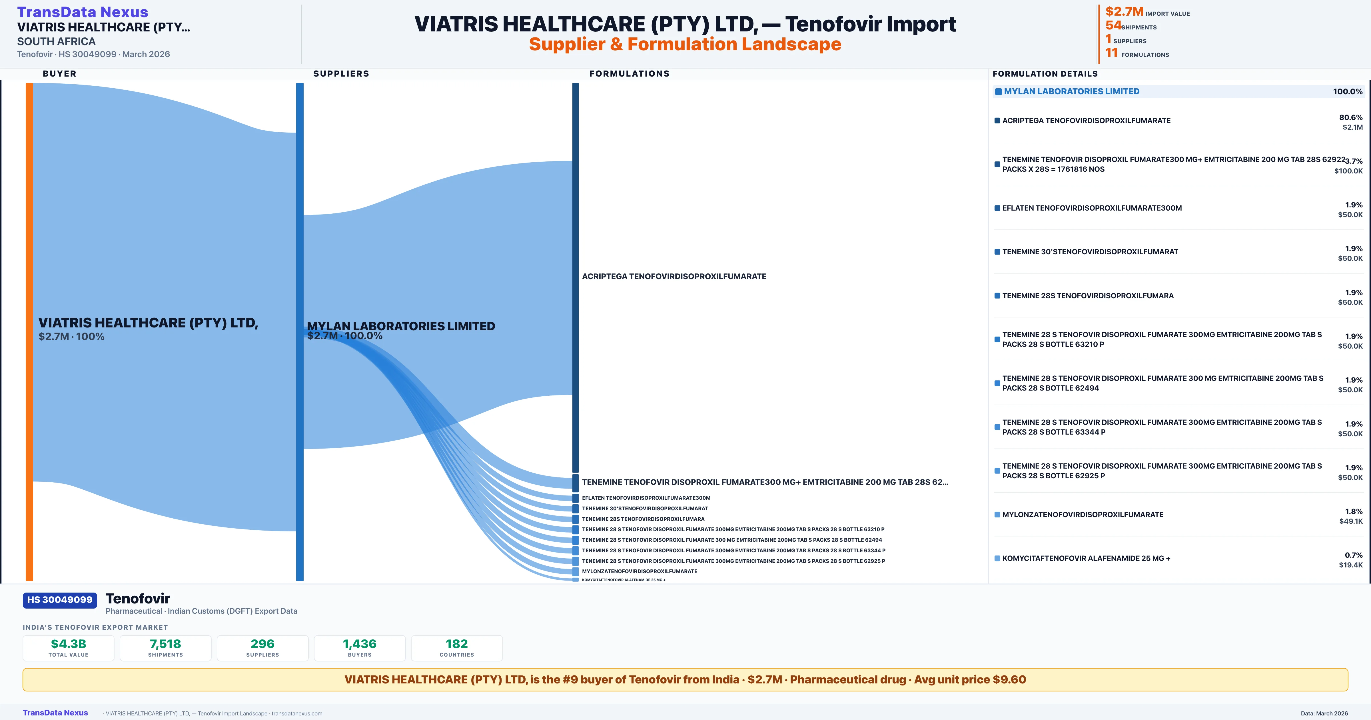 VIATRIS HEALTHCARE (PTY) LTD, sources Tenofovir from 1 verified Indian supplier: MYLAN LABORATORIES LIMITED ($2.7M, 100.0%). This is based on 54 customs records.