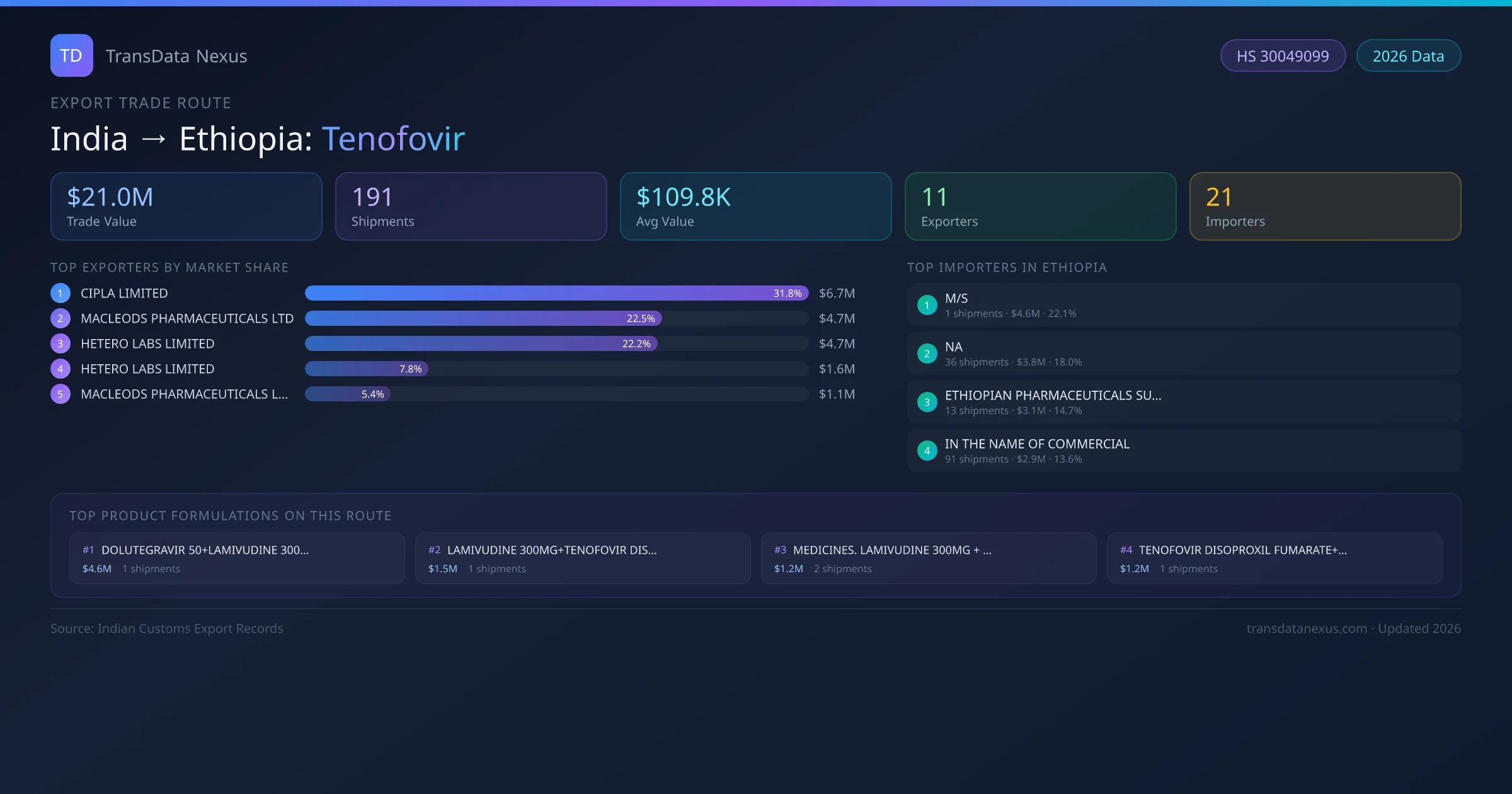 - 1.Route Identification: India to Ethiopia export trade corridor identified from Indian Customs (DGFT) records for Tenofovir.