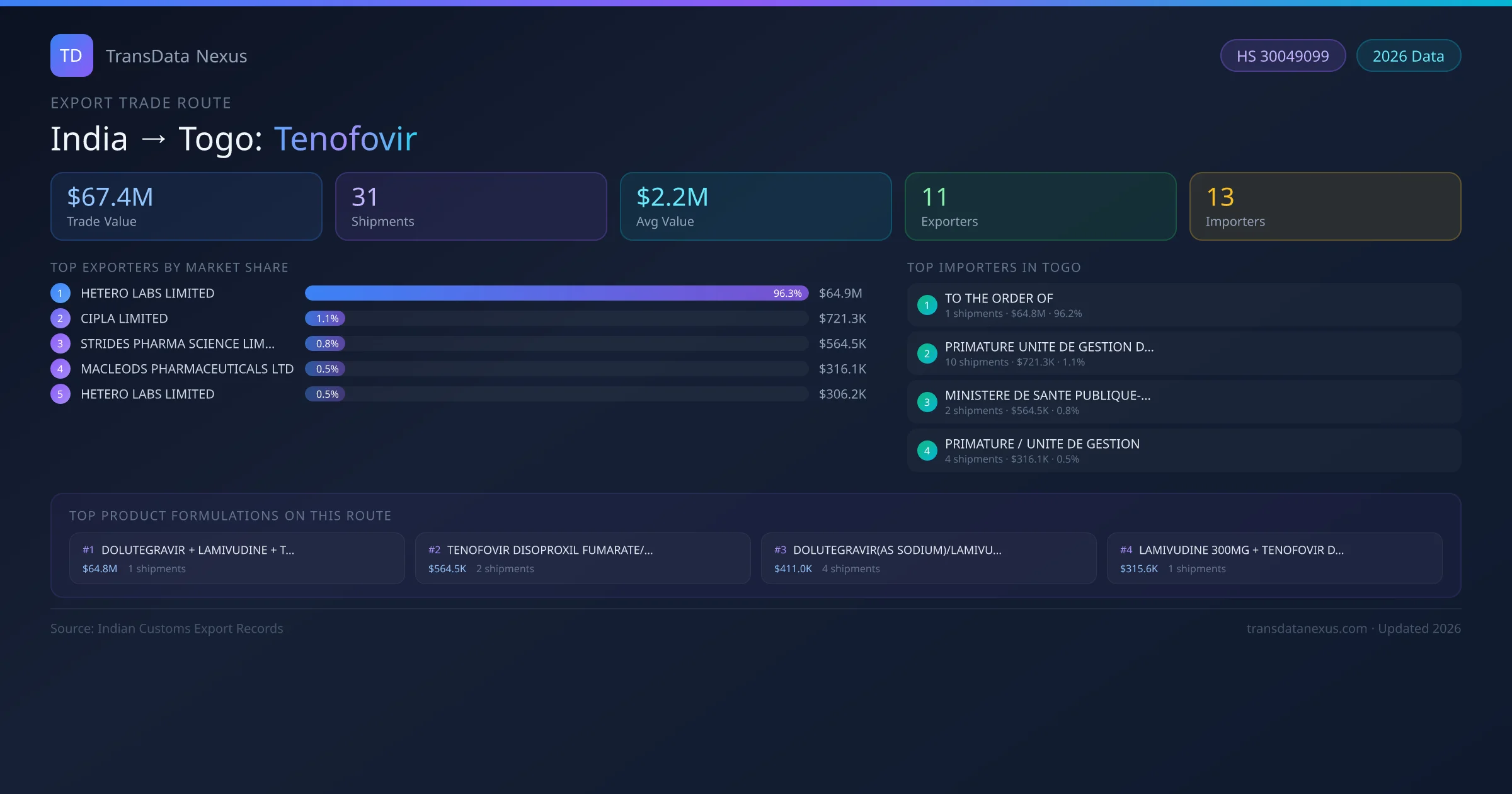 - 1.Route Identification: India to Togo export trade corridor identified from Indian Customs (DGFT) records for Tenofovir.
