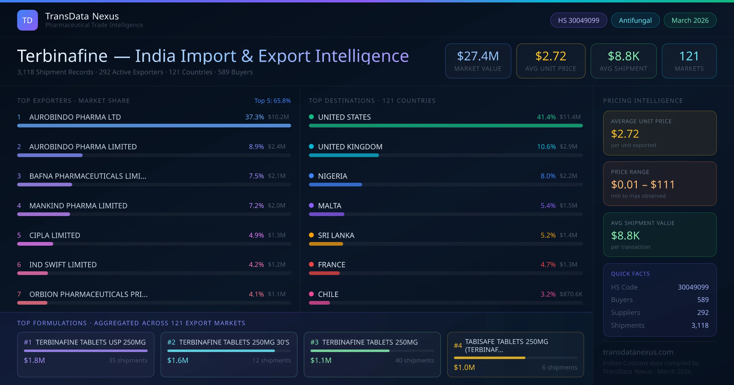 The average unit price for terbinafine exports from India is $2.72 per unit, with prices ranging from $0.01 to $110.70 depending on formulation and order volume.