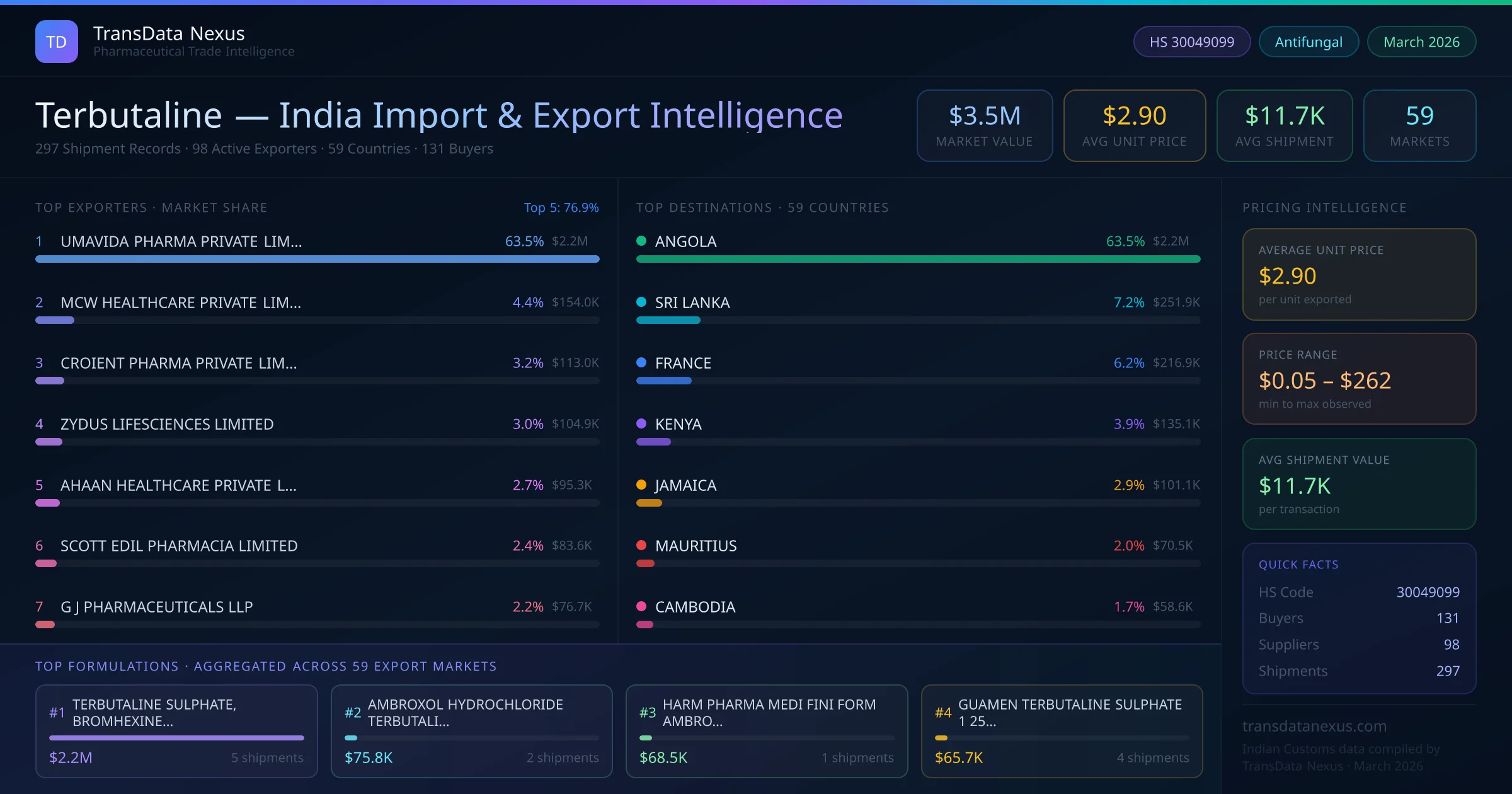 Between 2022 and 2026, India exported $3.5M worth of terbutaline across 297 verified shipments to 59 countries — covering 30% of world markets in the Respiratory & OTC segment. The largest destination is ANGOLA (63.5%). UMAVIDA PHARMA PRIVATE LIMITED leads with a 63.5% share. All figures are drawn from Indian Customs (DGFT) shipping bill records spanning four years of trade activity.
