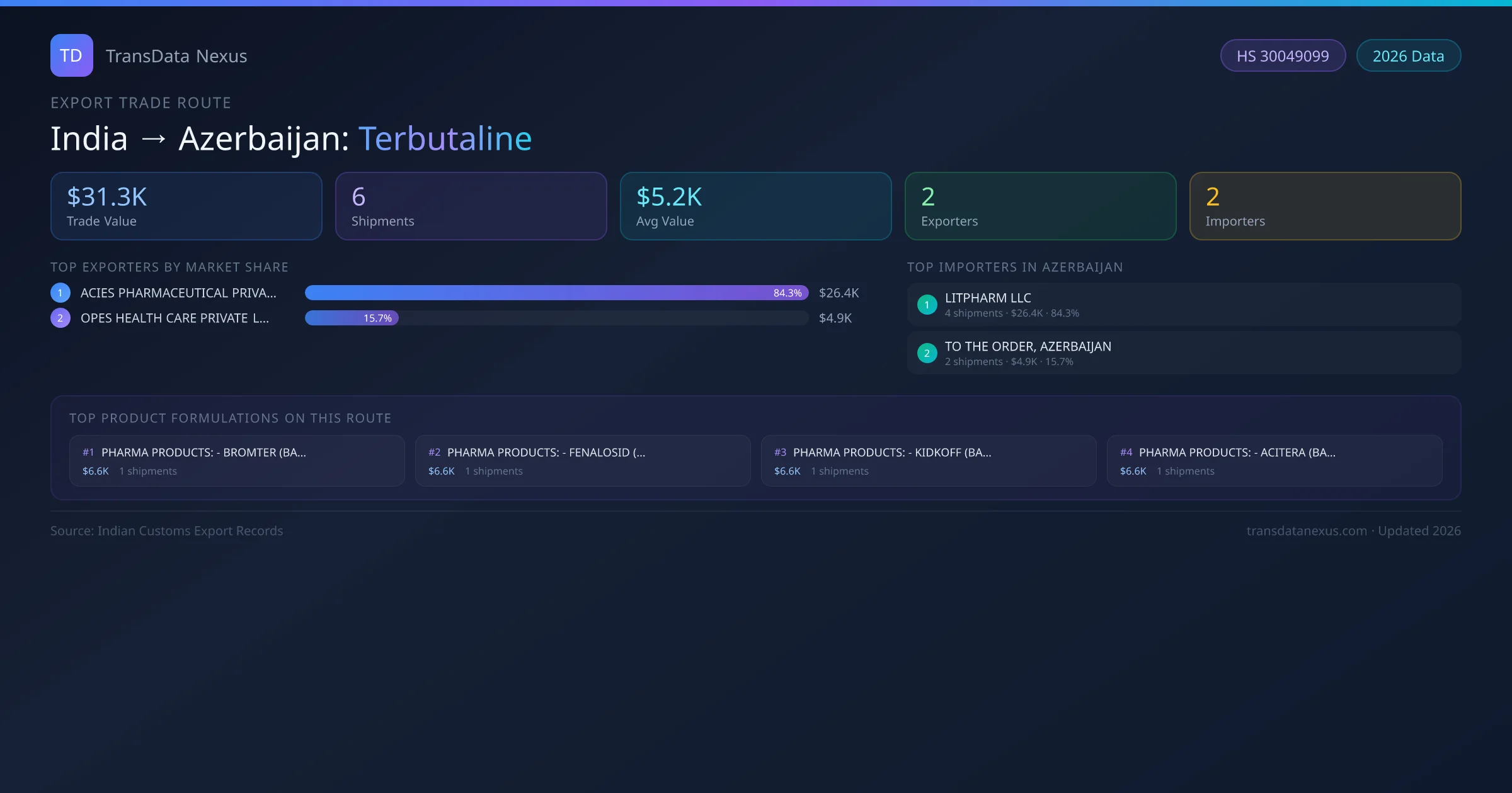 India has recorded 6 verified shipments of Terbutaline exported to Azerbaijan, representing a combined trade value of $31.3K USD. This corridor is served by 2 active Indian exporters, with an average shipment value of $5.2K USD. The leading Indian exporter is ACIES PHARMACEUTICAL PRIVATE LIMITED, which accounts for 84% of total export value with 4 shipments worth $26.4K USD. On the buying side, LITPHARM LLC is the largest importer in Azerbaijan with $26.4K USD in purchases. All data sourced from Indian Customs (DGFT) shipping bill records. Values reported in FOB USD.