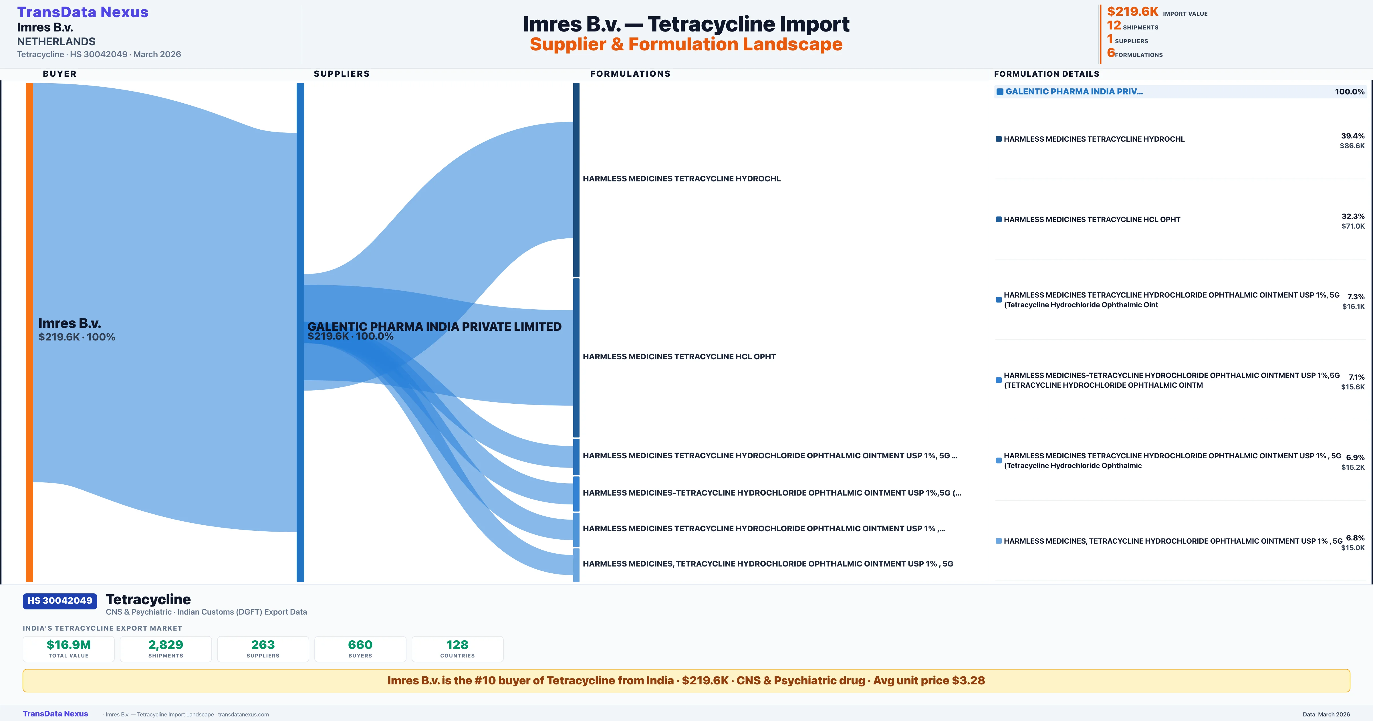 IMRES B.V. sources Tetracycline from 1 verified Indian supplier: GALENTIC PHARMA INDIA PRIVATE LIMITED ($219.6K, 100.0%). This is based on 12 customs records.