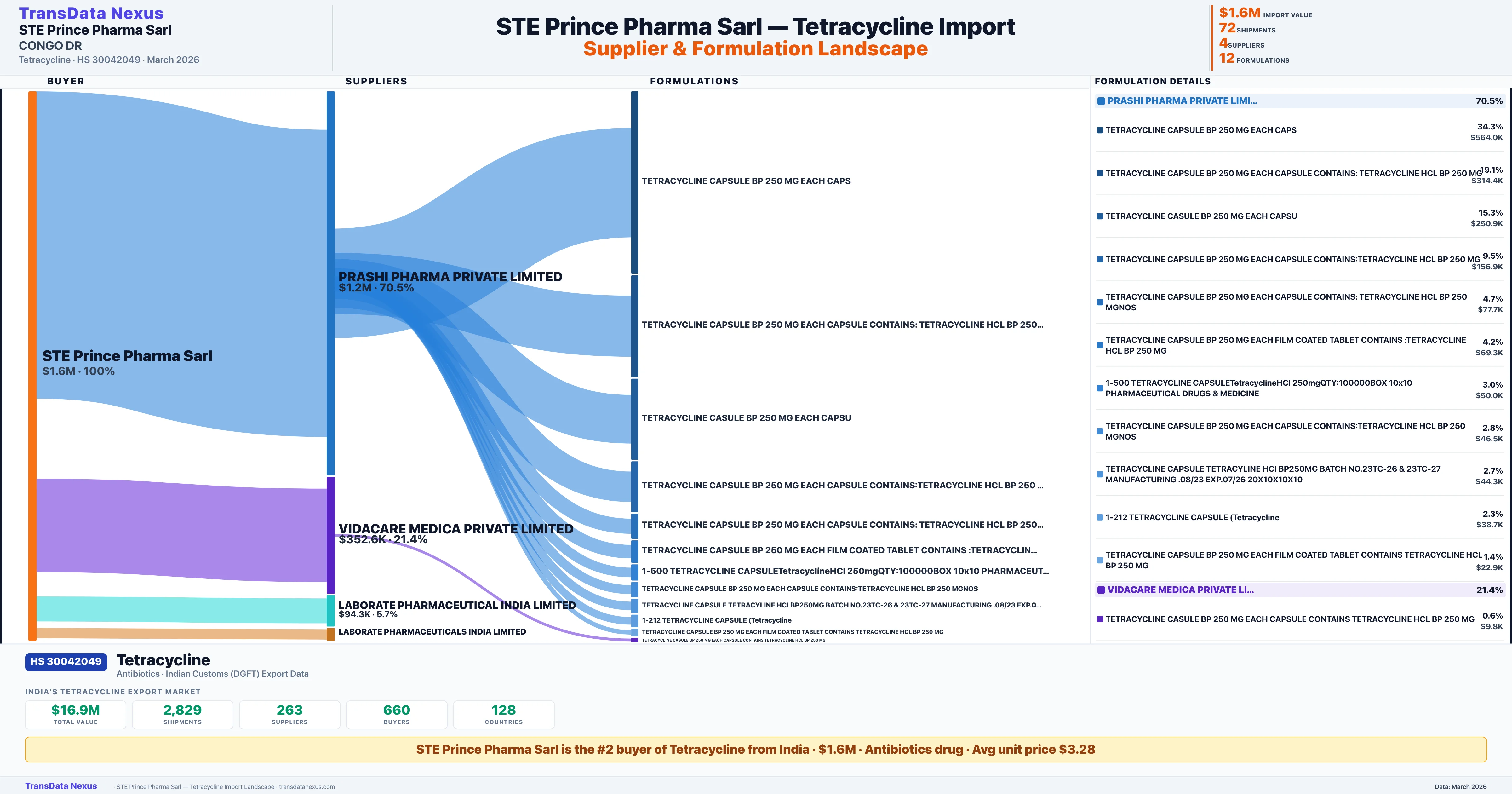 STE PRINCE PHARMA SARL sources Tetracycline from 4 verified Indian suppliers: PRASHI PHARMA PRIVATE LIMITED ($1.2M, 70.5%), VIDACARE MEDICA PRIVATE LIMITED ($352.6K, 21.4%), LABORATE PHARMACEUTICAL INDIA LIMITED ($94.3K, 5.7%), LABORATE PHARMACEUTICALS INDIA LIMITED ($38.7K, 2.3%). This is based on 72 customs records.