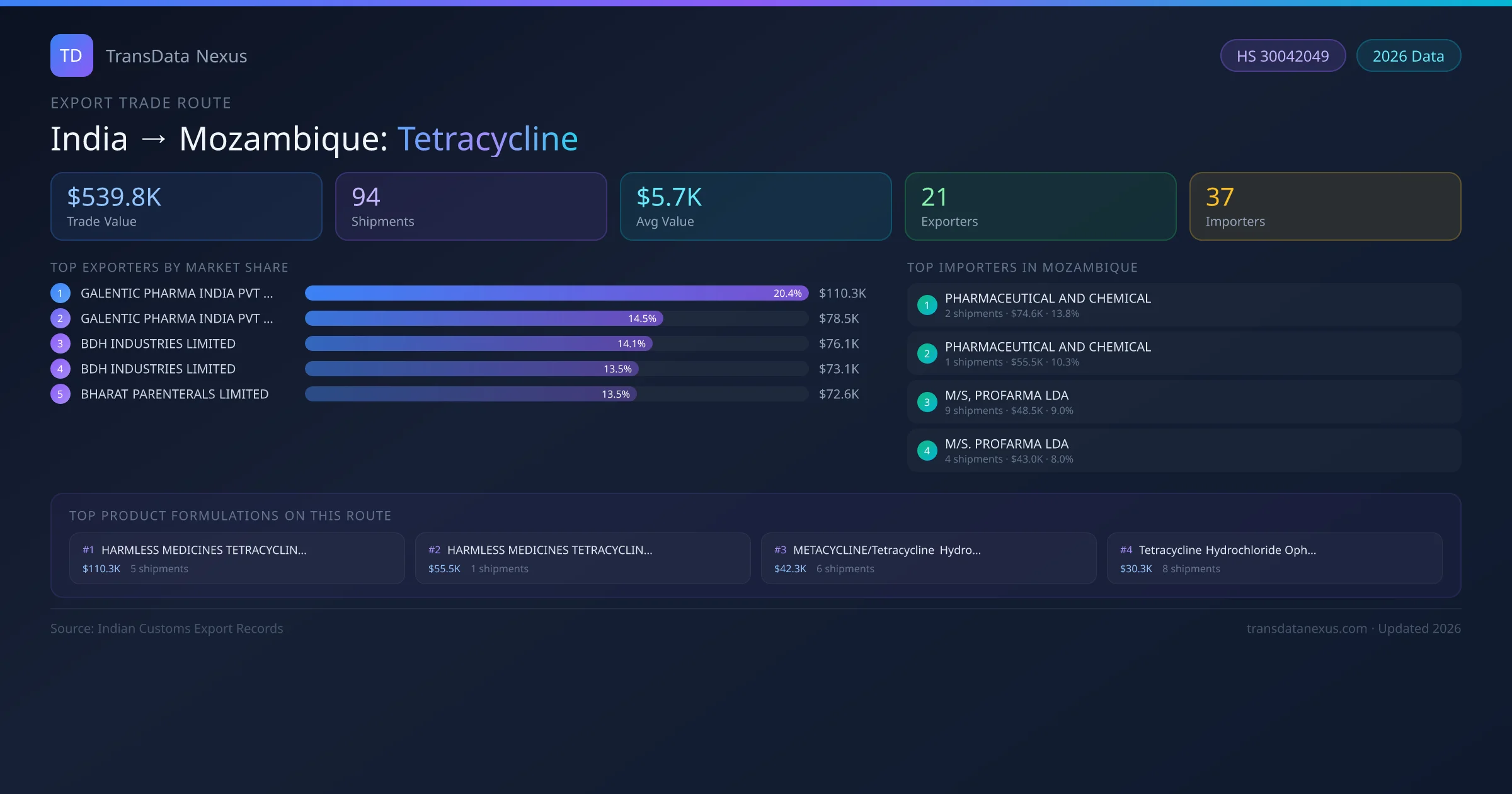 - 1.Route Identification: India to Mozambique export trade corridor identified from Indian Customs (DGFT) records for Tetracycline.