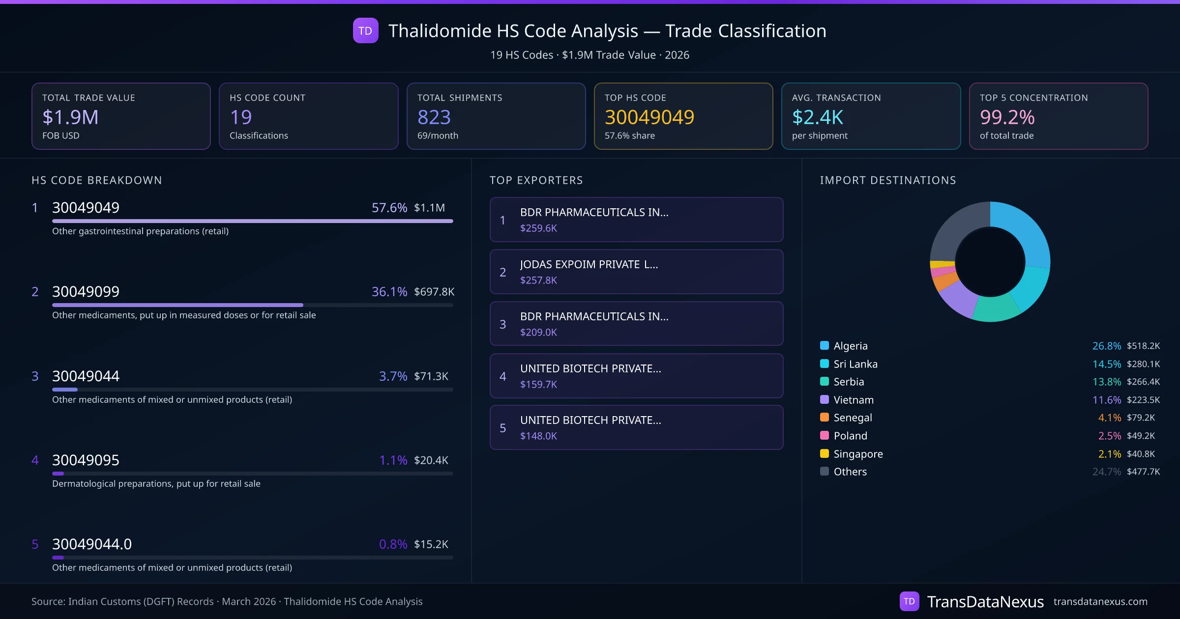 India exports Thalidomide under 19 distinct HS code classifications, representing a total trade value of $1.9M across 823 shipments. The dominant classification is HS 30049049 (Other gastrointestinal preparations (retail)), accounting for 57.6% of all Thalidomide trade at $1.1M. HS 30049099 (Other medicaments, put up in measured doses or for retail sale) follows at 36.1% ($697.8K). The top 5 HS codes together account for 99.2% of total Thalidomide trade from India. The average transaction value is $2351. Key importing markets include Algeria, Sri Lanka, Serbia. Leading exporters include BDR PHARMACEUTICALS INTERNATIONAL PRIVATE LIMITED and JODAS EXPOIM PRIVATE LIMITED. Data sourced from Indian Customs (DGFT) shipping bill records.