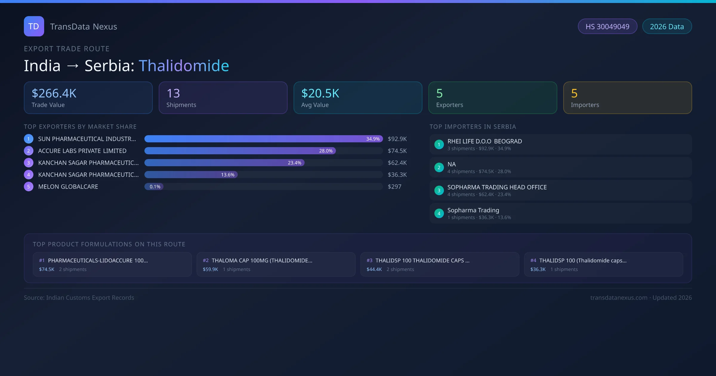 India has recorded 13 verified shipments of Thalidomide exported to Serbia, representing a combined trade value of $266.4K USD. This corridor is served by 5 active Indian exporters, with an average shipment value of $20.5K USD. The leading Indian exporter is SUN PHARMACEUTICAL INDUSTRIES LIMITED, which accounts for 35% of total export value with 3 shipments worth $92.9K USD. On the buying side, RHEI LIFE D.O.O BEOGRAD is the largest importer in Serbia with $92.9K USD in purchases. The top 3 suppliers — SUN PHARMACEUTICAL INDUSTRIES LIMITED, ACCURE LABS PRIVATE LIMITED, KANCHAN SAGAR PHARMACEUTICALS — together control 86% of total trade value on this route. All data sourced from Indian Customs (DGFT) shipping bill records. Values reported in FOB USD.