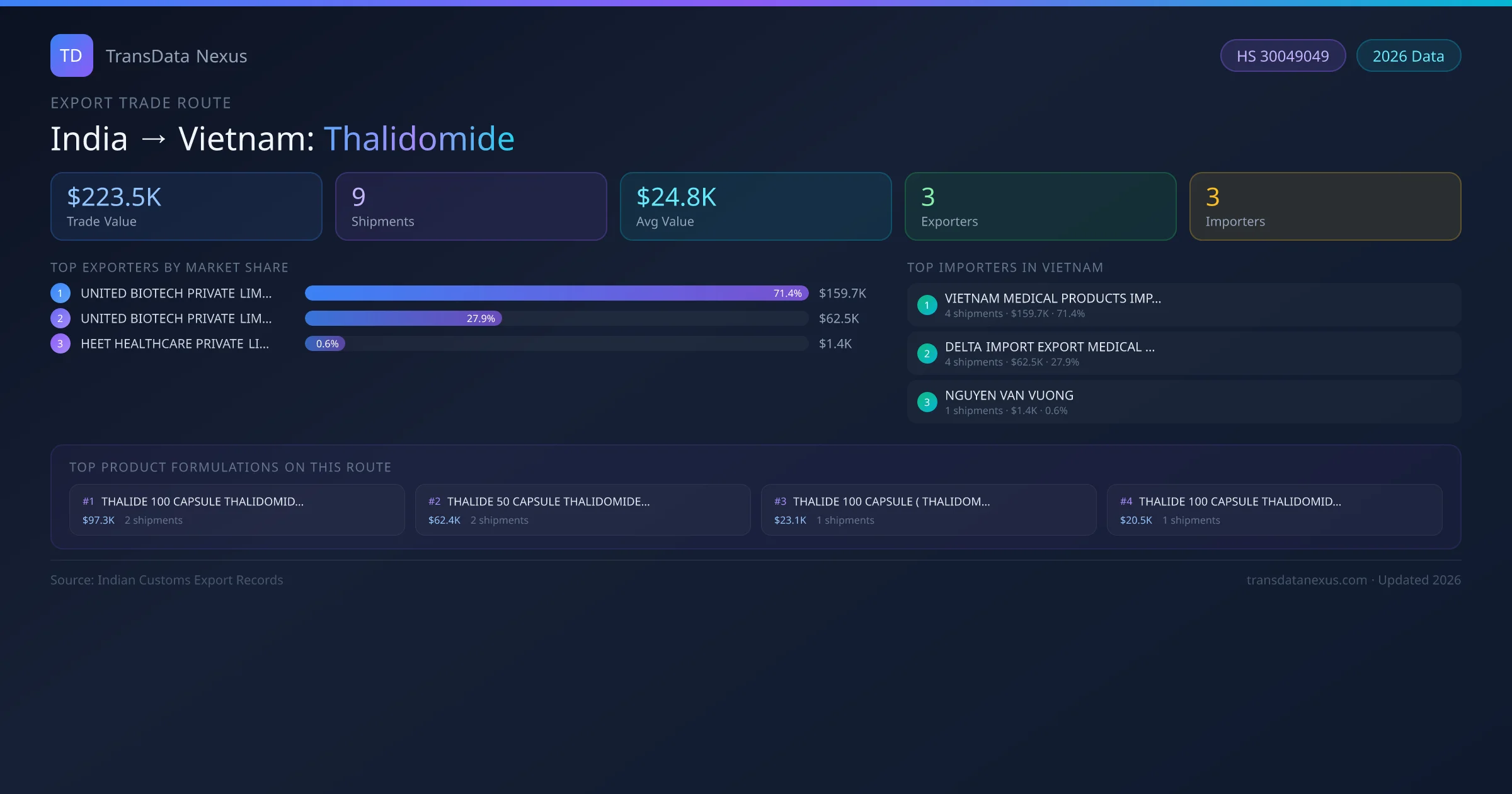- 1.Route Identification: India to Vietnam export trade corridor identified from Indian Customs (DGFT) records for Thalidomide.