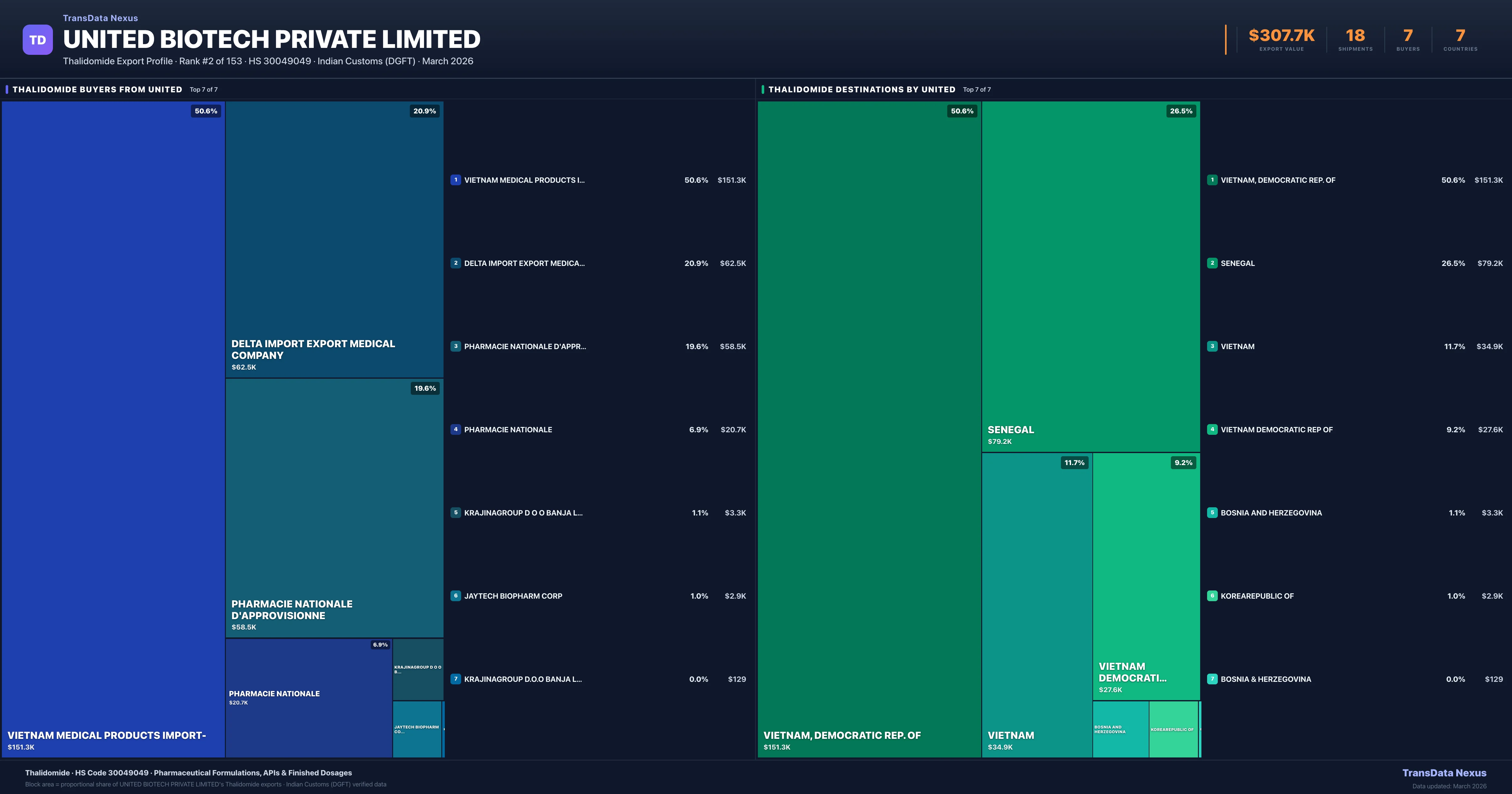 Access shipment-level details, pricing data, buyer connections, and competitive analysis for United Biotech Private Limited's Thalidomide exports. TransData Nexus provides verified Indian Customs (DGFT) data trusted by pharmaceutical trade professionals worldwide.