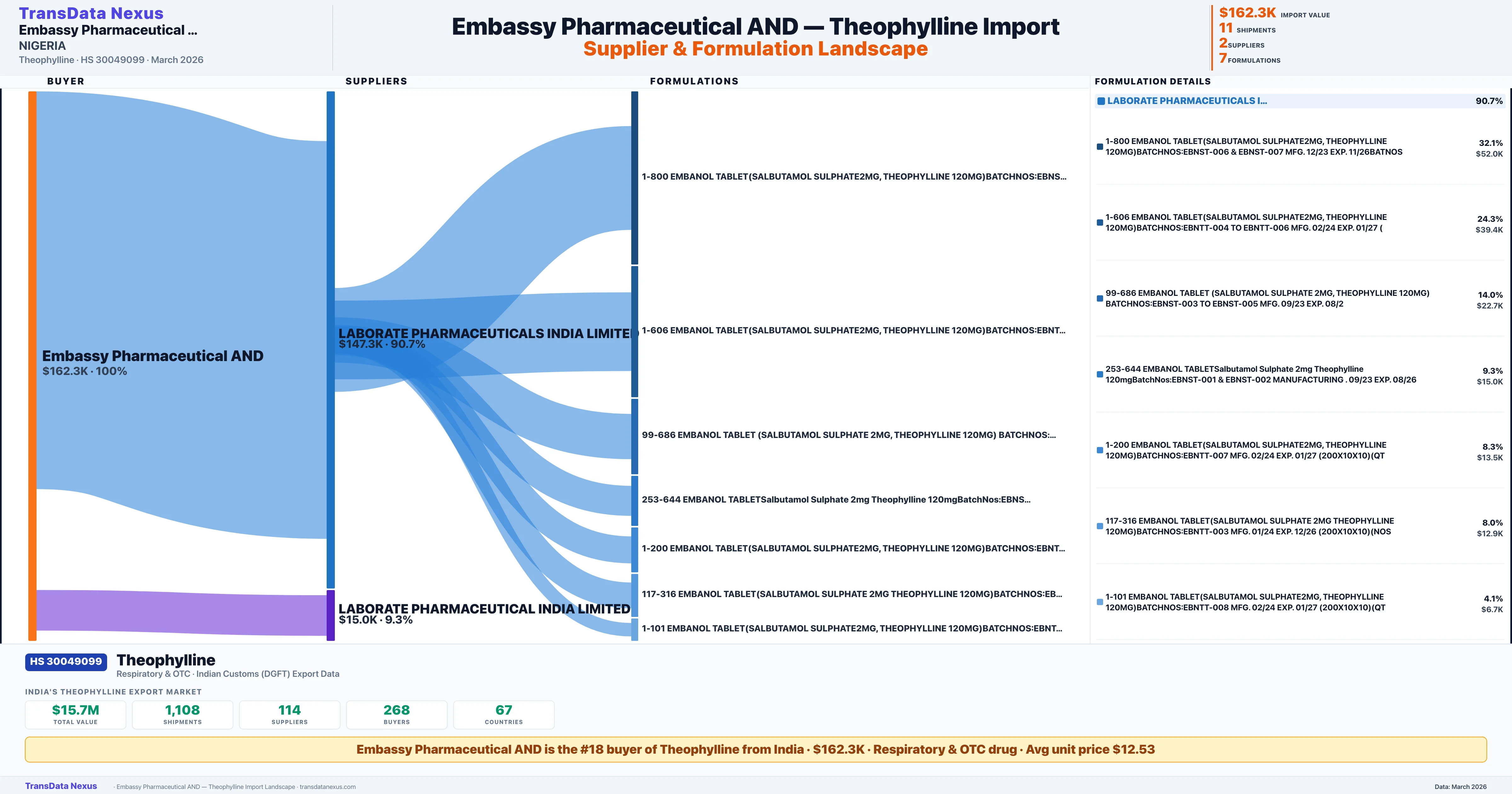 EMBASSY PHARMACEUTICAL AND imports Theophylline to 1 country. The primary destination is NIGERIA receiving 100.0% of shipments worth $162.3K.