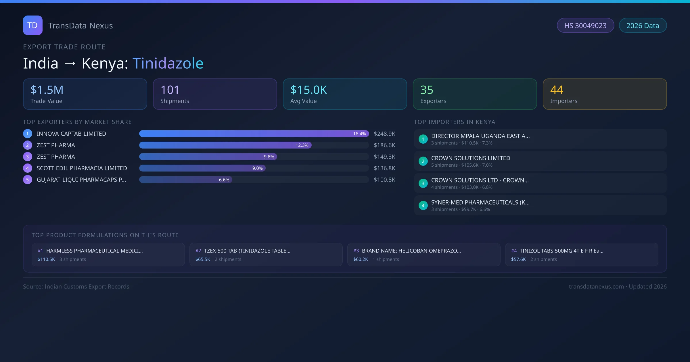 India has recorded 101 verified shipments of Tinidazole exported to Kenya, representing a combined trade value of $1.5M USD. This corridor is served by 35 active Indian exporters, with an average shipment value of $15.0K USD. The leading Indian exporter is INNOVA CAPTAB LIMITED, which accounts for 16% of total export value with 10 shipments worth $248.9K USD. On the buying side, DIRECTOR MPALA UGANDA EAST AFRICA is the largest importer in Kenya with $110.5K USD in purchases. The top 3 suppliers — INNOVA CAPTAB LIMITED, ZEST PHARMA, ZEST PHARMA — together control 39% of total trade value on this route. All data sourced from Indian Customs (DGFT) shipping bill records. Values reported in FOB USD.