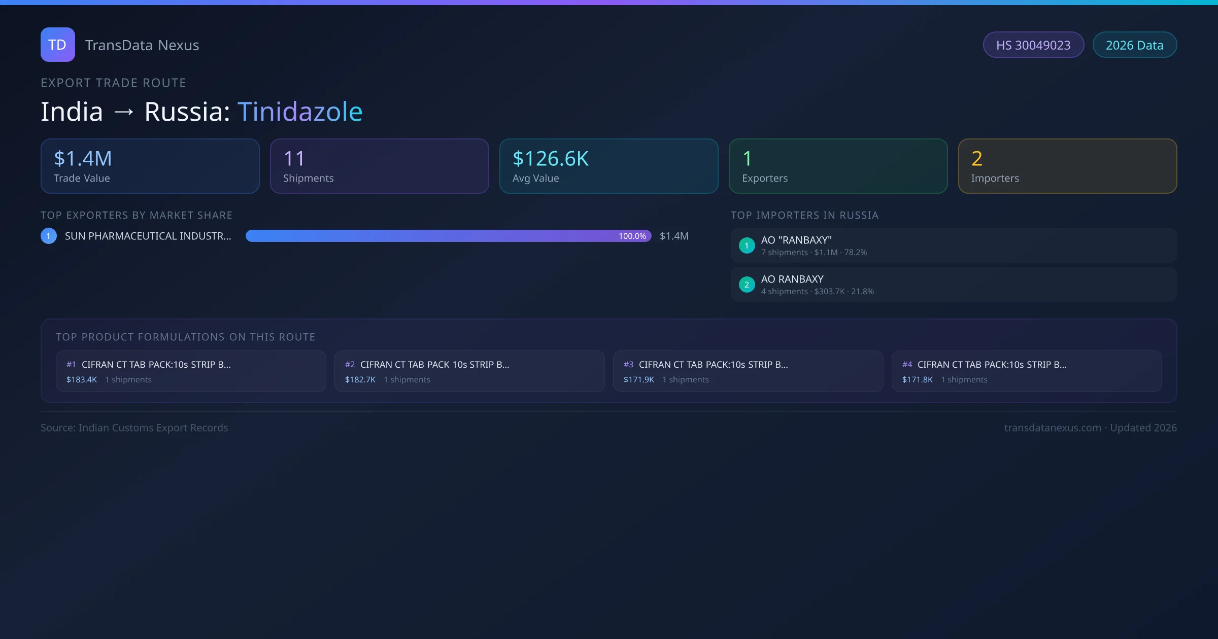 - 1.Route Identification: India to Russia export trade corridor identified from Indian Customs (DGFT) records for Tinidazole.