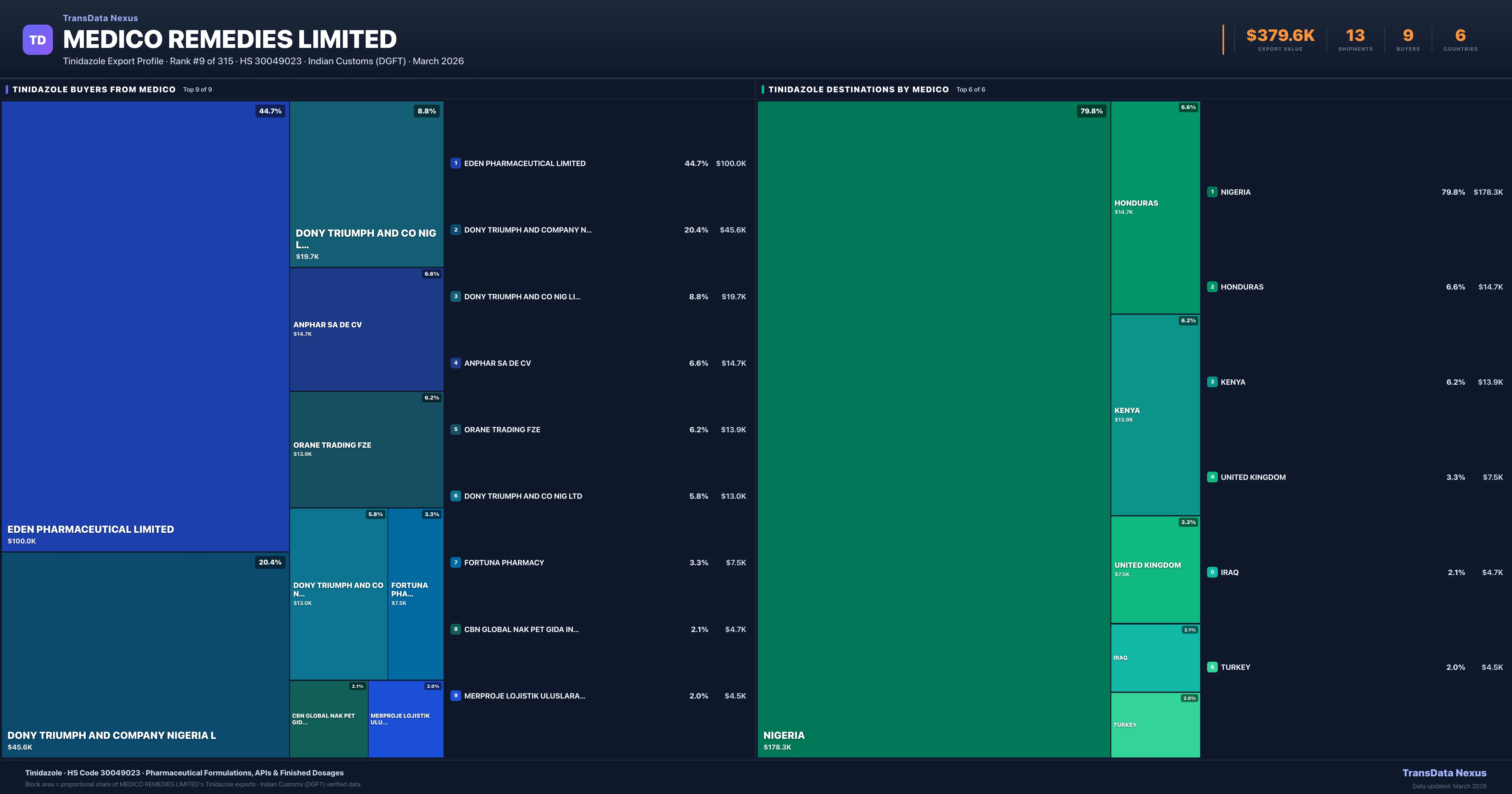 Medico Remedies Limited supplies Tinidazole to 9 buyers globally. The largest buyer is EDEN PHARMACEUTICAL LIMITED (NIGERIA), followed by DONY TRIUMPH AND COMPANY NIGERIA L (NIGERIA) and DONY TRIUMPH AND CO NIG LIMITED (NIGERIA). These buyers represent pharmaceutical distributors, hospital groups, and government procurement agencies in their respective markets.